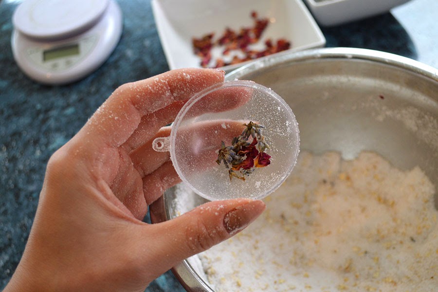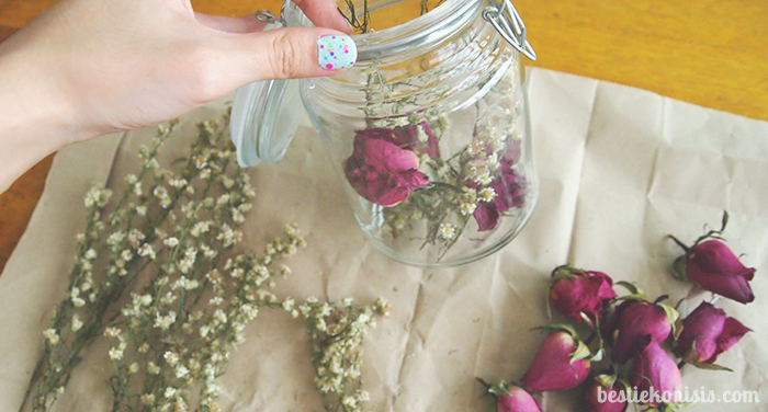 材料:100g 檸檬酸、290g 梳打粉、25g 快熟麥片、1/4茶匙 薰衣草精油 、1/8茶匙 玫瑰天竺葵精油、噴霧裝金縷梅花水、乾花、浴球模