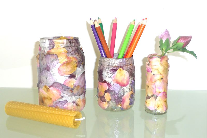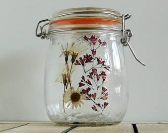 同樣以白膠漿,把乾花貼在不同家品上,例如筆筒、玻璃瓶、水壺等,就可以為它們換身裝。又可以選擇把乾花放入用完的玻璃樽內,變成一個小花園,為屋企增添一點韻味。