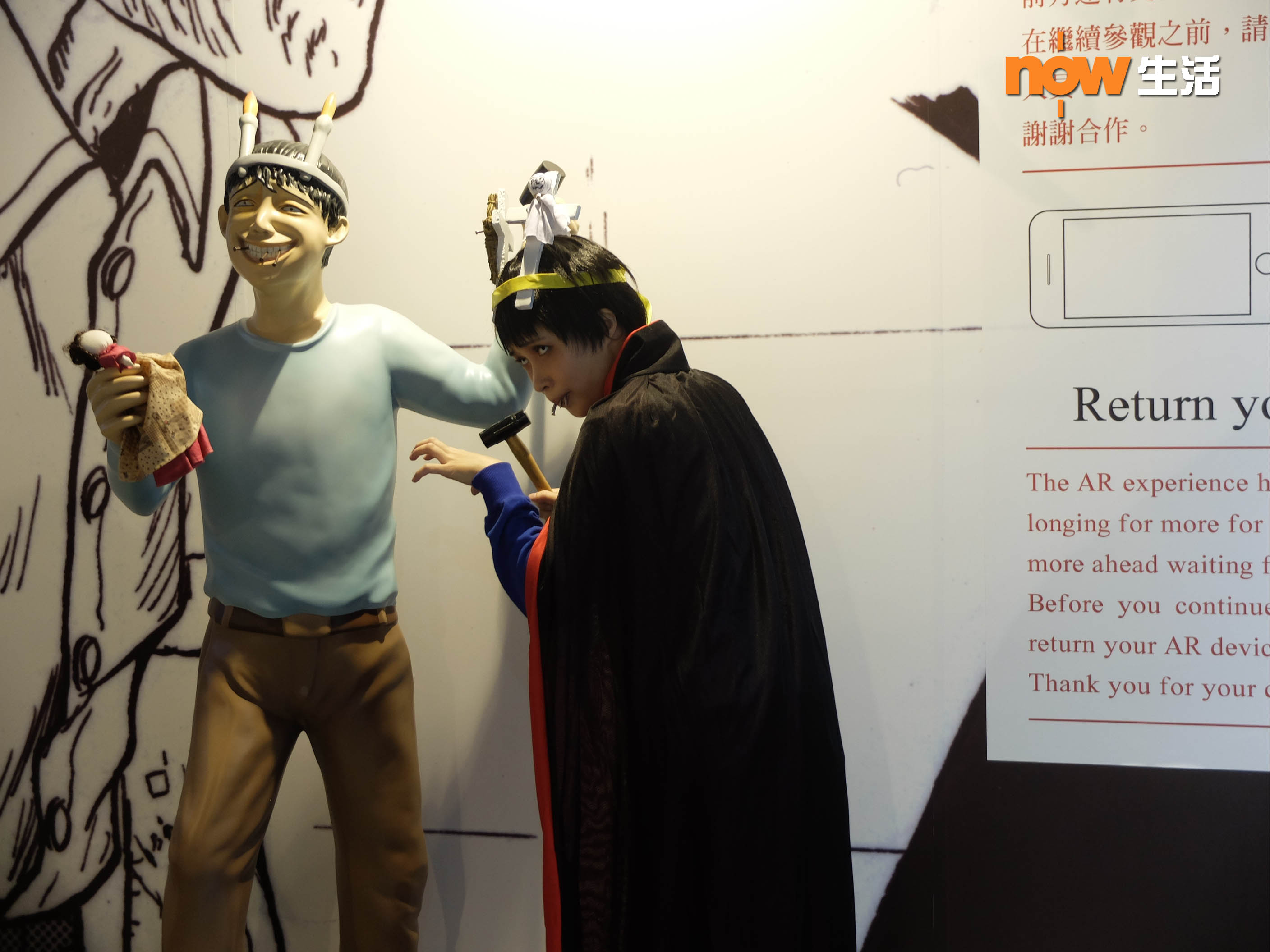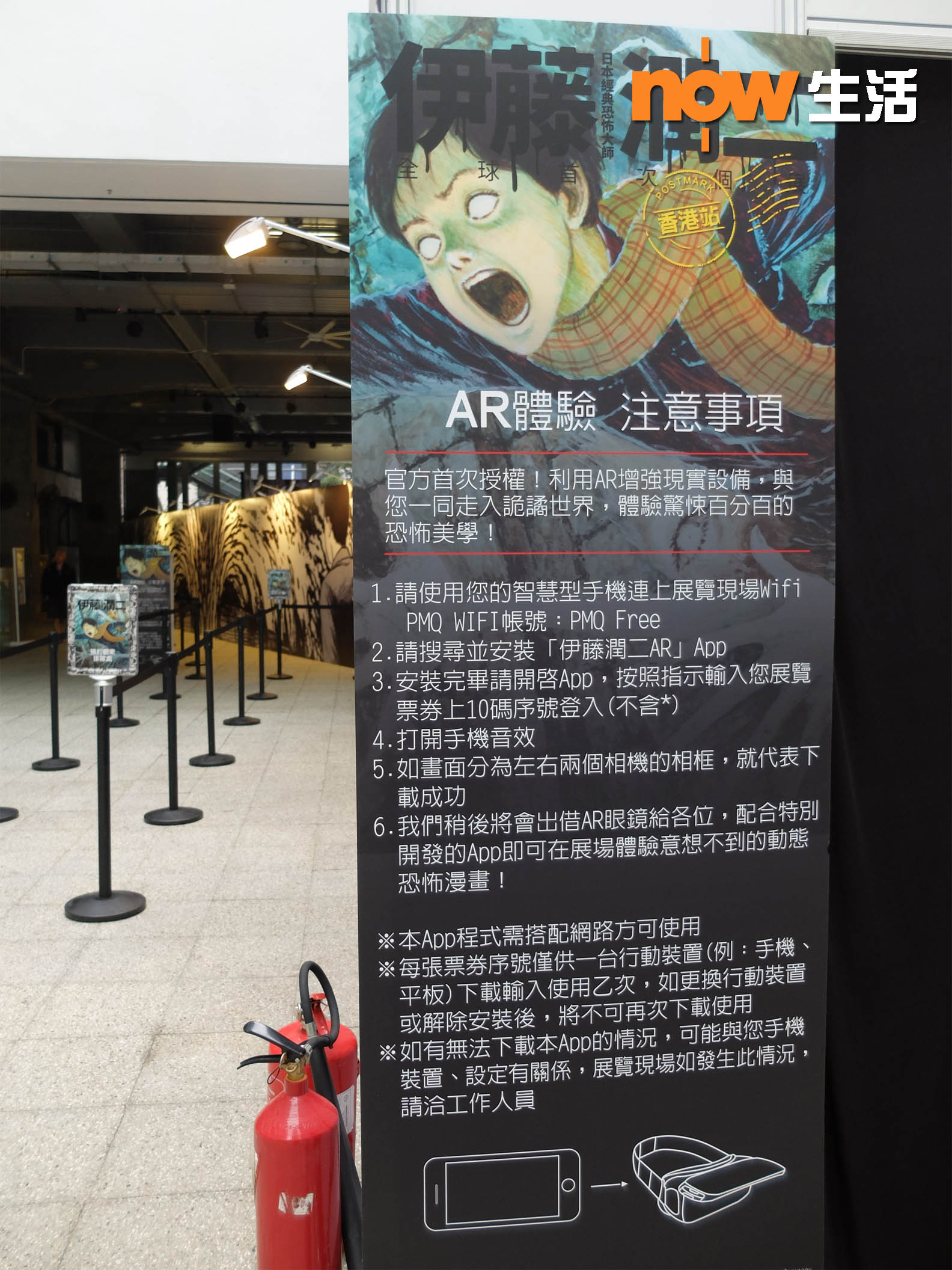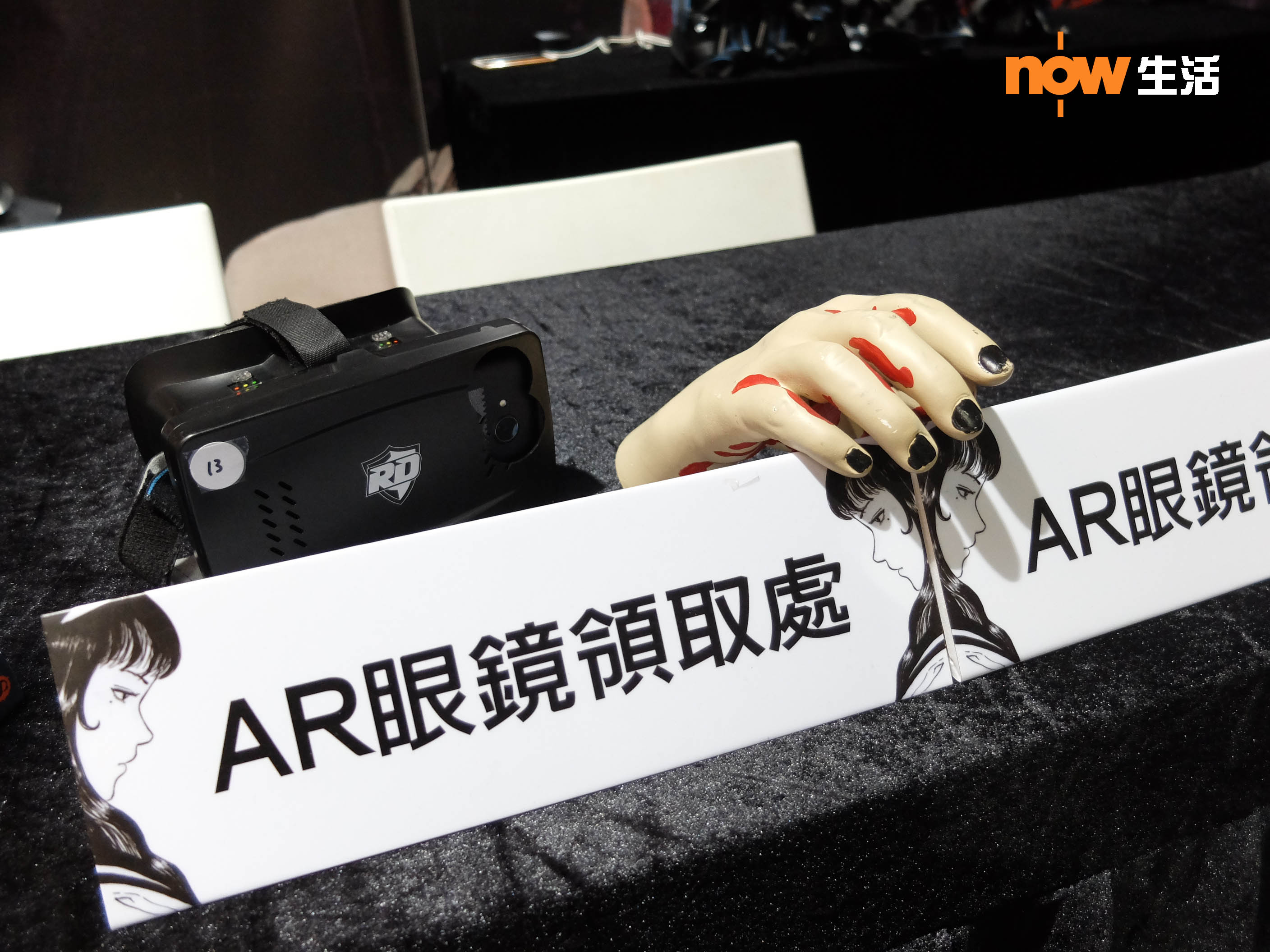 展覽第一部分就是AR互動體驗展區,大家最好預先在手機下載「伊藤潤二AR」App,入場後會獲發AR眼鏡,將手機放入AR眼鏡後,就會看到伊藤老師的經典恐怖畫面「動起來」,近距離出現於眼前,雞皮疙瘩馬上豎起來!