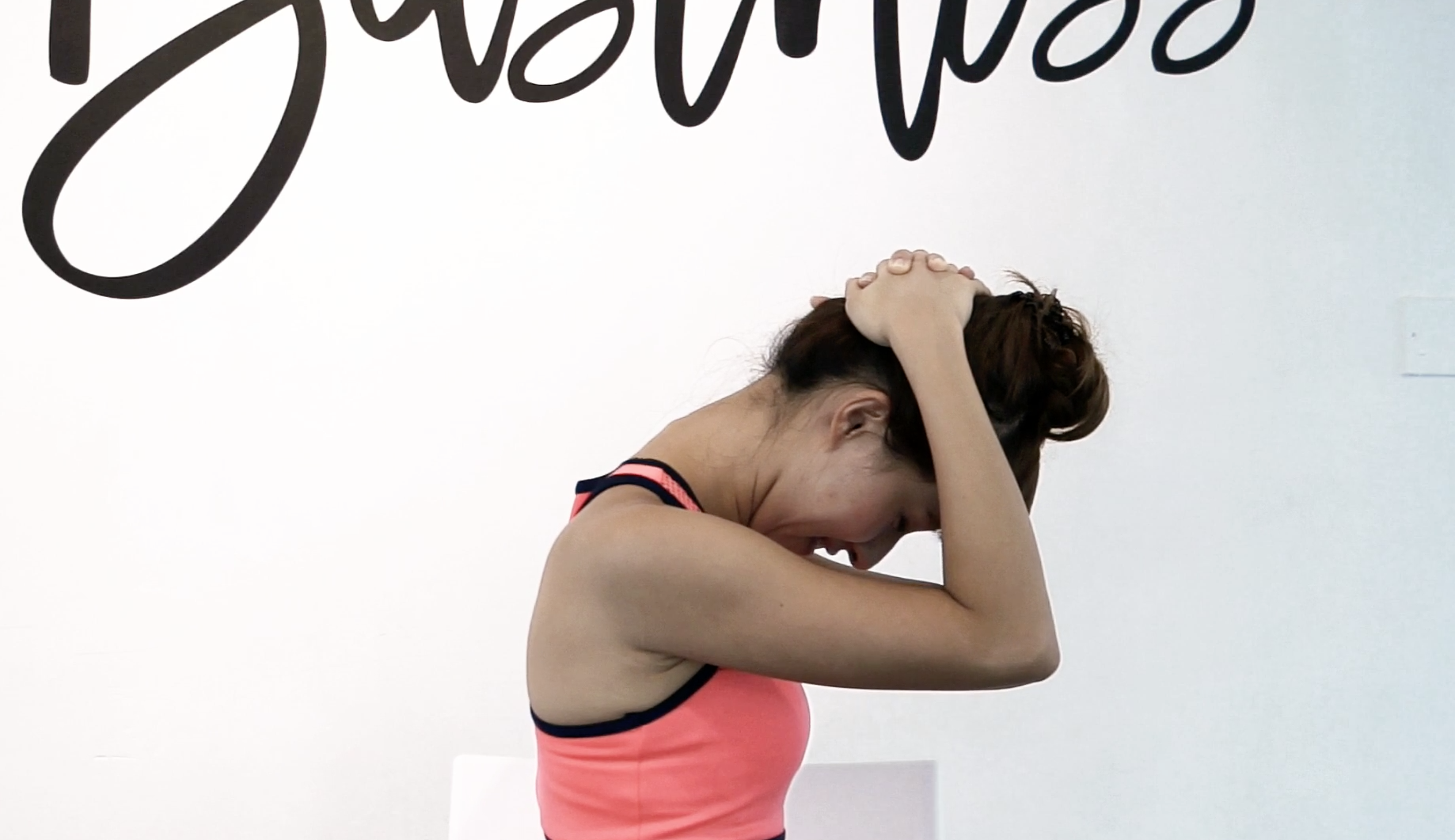 第二個動作,伸展頸後。先吸氣,呼氣時頭慢慢向下,雙手互扣放後尾枕,手踭指向地,維持5-10個呼吸,完成動作後,手放大脾,慢慢抬頭。