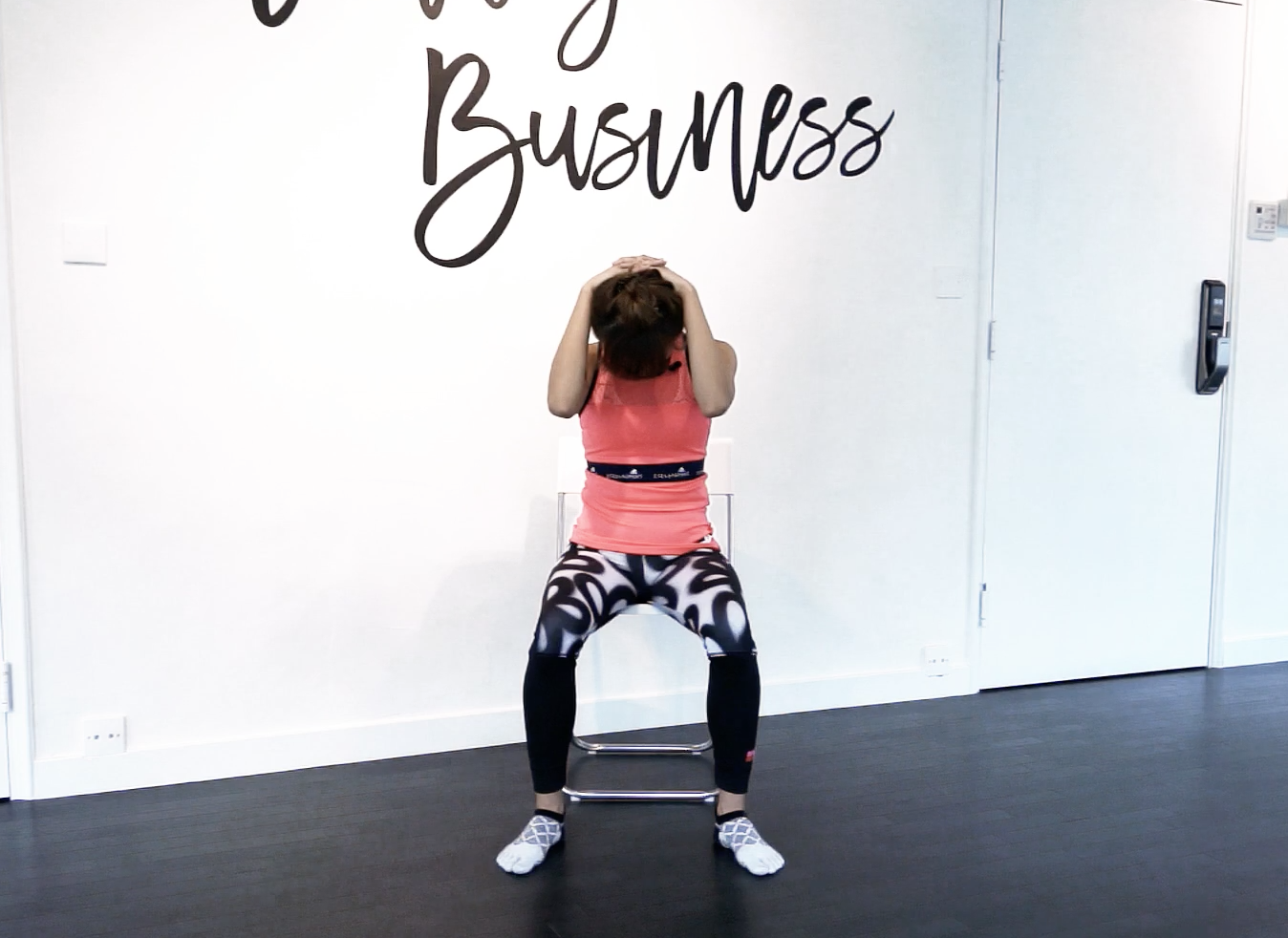 第三個動作,伸展前胸同埋二頭肌。坐到靠邊嘅位置,雙手捉實椅背邊,較柔軟嘅人手可以放椅背上,胸部慢慢向前推,膊頭向後轉動,維持5-10個呼吸,完成後慢慢放鬆背部,逐隻手放低。
