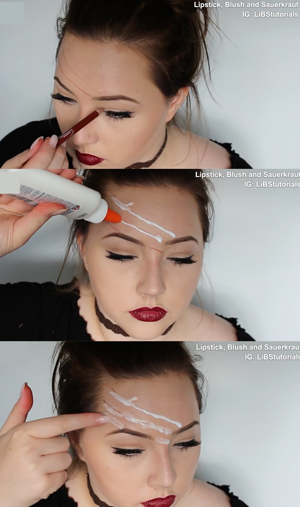 1.)在額邊用唇線筆畫幾條斜線摸仿抓痕