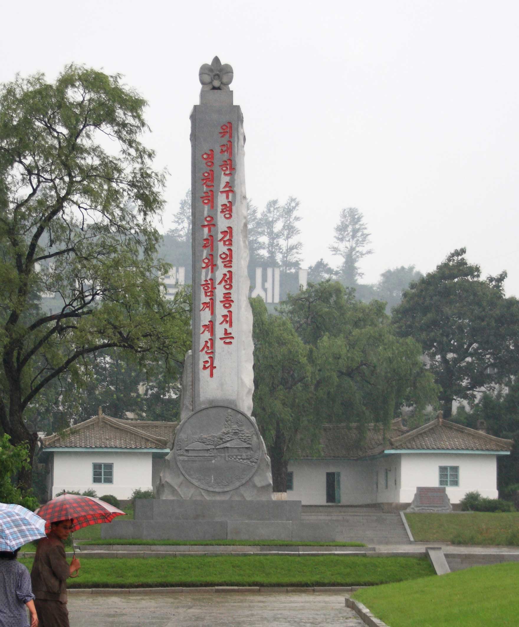 因為1912年,第一個太陽在這裡誕生。4月15日,天空出現兩道彩虹,預示偉人的誕生。位於平壤郊區,綠草如茵的公園中央,孤單著兩間保存完美的上世紀茅草屋。1994年金日成死後,金正日下令改變北韓的曆法,不再使用西曆,而用主體曆。主體曆元年,就是1912年,那就是金日成出生的年份。