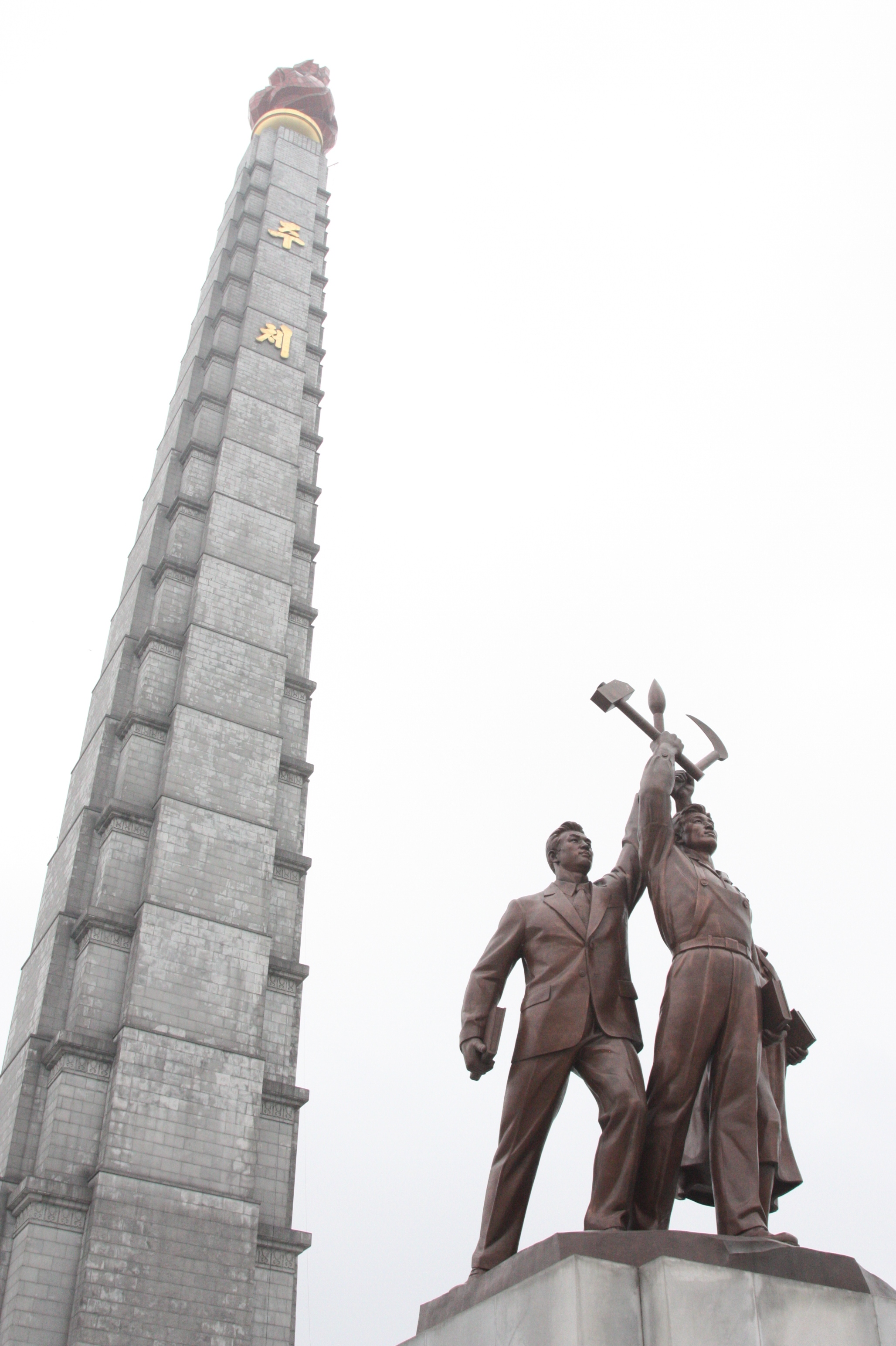 矗立在大同江邊,170米高的主體思想塔。塔尖的火炬代表金日成的主體思想,照耀全球,塔身上半部前後各用朝鮮文嵌有「主體」兩個大字。塔正面立有工人、農民和知識分子三人銅像,高舉由錘子、鐮刀和毛筆組成的朝鮮勞動黨黨徽作前進狀。北韓人對數字很有執著的迷信。思想塔身由25, 550塊白色花崗岩砌成,象徵金日成七十歲的總共天數(365 x 70)。塔身前後各18節,左右各17節,合計70節,意在紀念金日成七十歲壽辰。晚上火炬長明,由我住的羊角島酒店也可以看得到。