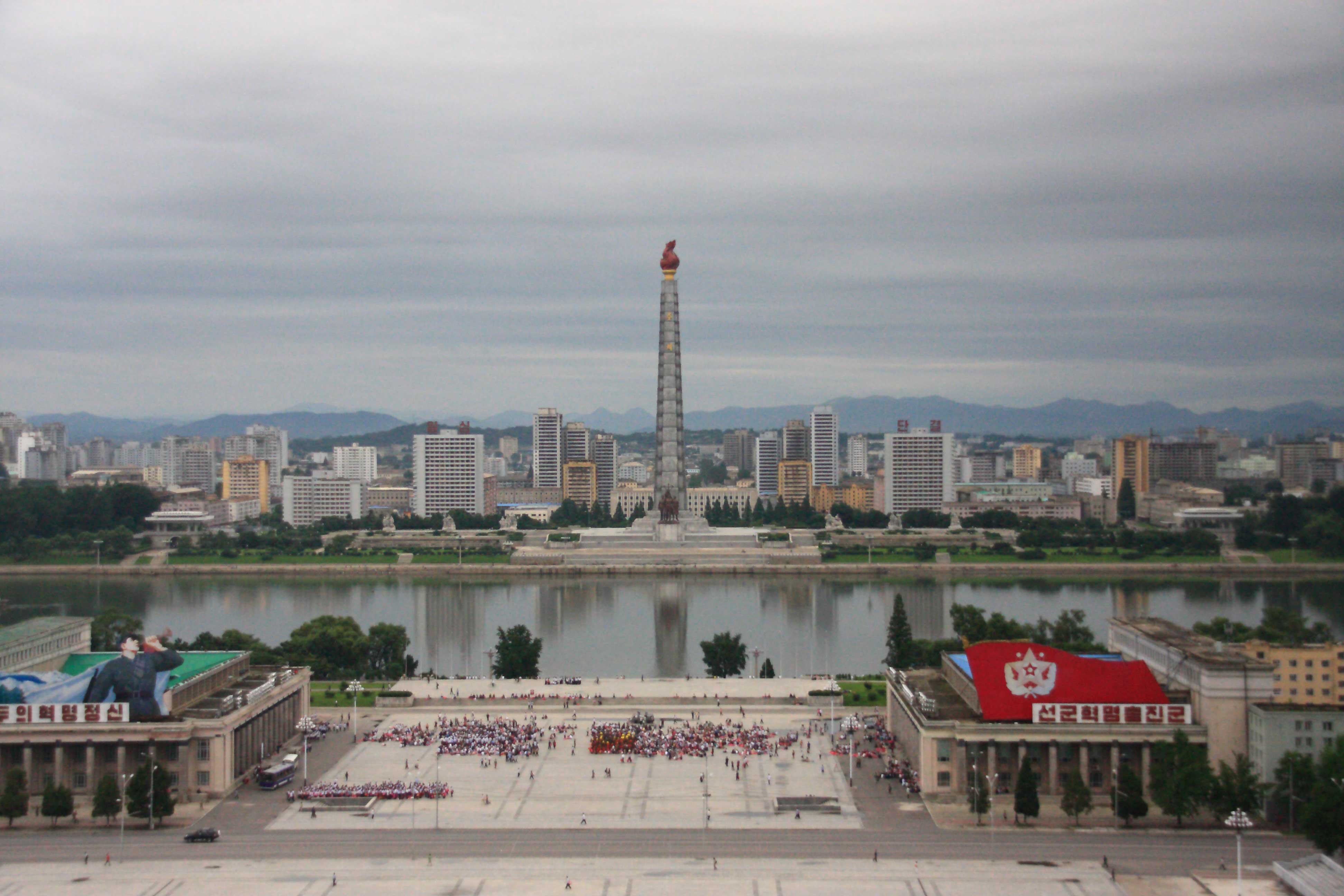 金日成廣場是首都的中央廣場,臨大同江畔,主體思想塔的對面,1954年8月竣工,面積75000平方米,為世界第16大廣場。地面是花崗岩鋪地。臨江正面為主體思想塔。左邊是萬壽台藝術劇院,在七十年代風靡大陸的北韓劇「賣花姑娘」,曾經在這晚晚上映。右邊是萬壽台議事堂(人民大會堂),北韓最高權力機構「人大」開會的地方,五年任期。後面是人民大學習堂(中央圖書館)。