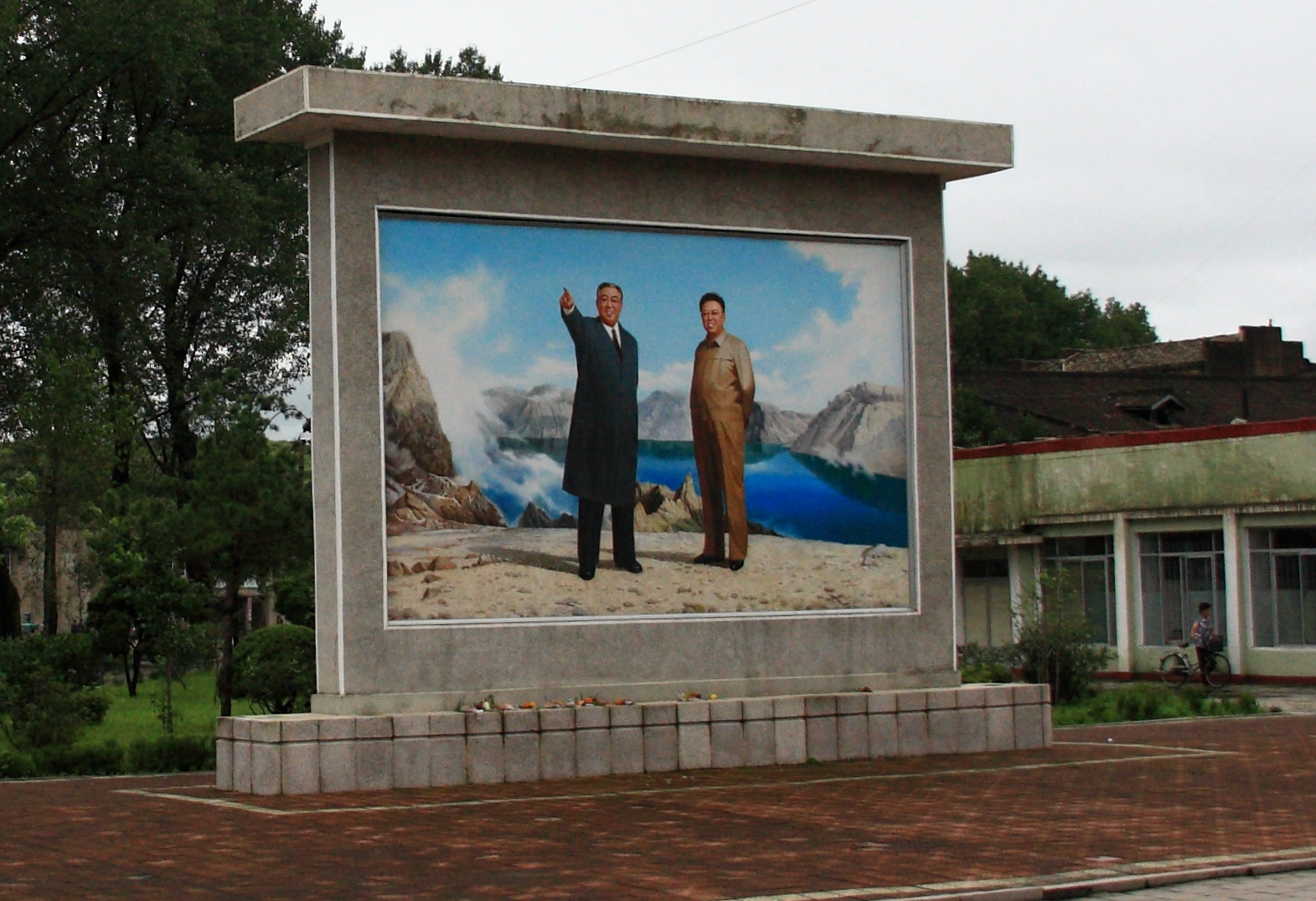 半個世紀以來,日以繼夜,照耀平壤大街小巷的,是北韓獨有的那一道風景線,那一輪永不日落的太陽。城鄉每一個十字路口、每一條村莊廣場,總有鮮艷無比的色彩、濃烈強勁的畫風、大紅大綠的背景、巨型偉岸的口號,襯托出中央一位光明偉岸的慈父。無數小孩們眾星拱月,仰望天父一般的眼神。他那慈祥的臉龐、甜美的酒窩,散發出溫暖的金黃光彩。不管市內的建築多破爛,這些巨型海報像昨天才畫好一樣嶄新。更多是用馬塞克精嵌成的馬塞克畫,因為那代表永不褪色。