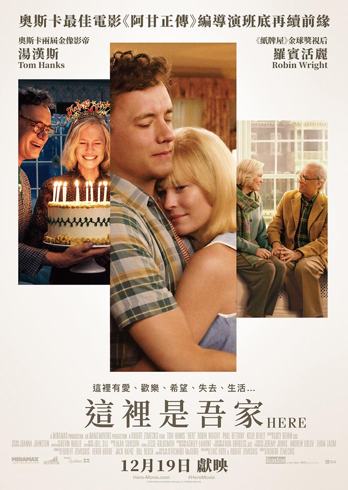 奧斯卡最佳電影《阿甘正傳》上映 30 周年,奧斯卡金像導演羅拔湛米基斯與片中男女主角湯漢斯、羅賓活麗再續前緣,合作講述一個關於愛、失去、歡笑和生活的故事。《這裡是吾家》HERE 改編自 Richard McGuire 同名漫畫,講述在嬰兒潮世代出生的理察(湯漢斯飾)與女友瑪嘉烈(羅賓活麗飾),由十餘歲認識到拍拖、結婚,然後終老,橫跨數十年的人生歷程。帶領觀眾走進一個美國家庭的客廳中,以不變的視角,靜靜凝視人來人往,陪他們度過一整個世紀悲喜交集的生活日常。由「這裡」,開展一段電影時光之旅。