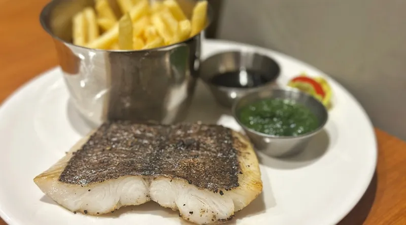 魚皮煎到脆卜卜,鎖住咗魚油,令魚肉非常之綿,達到外脆內軟嘅效果。可以配上阿根廷香草醬或蒸魚豉油,其中阿根廷香草醬,非常清新,令魚油非常豐富嘅比目魚,減低油膩感,達到另一個層次。