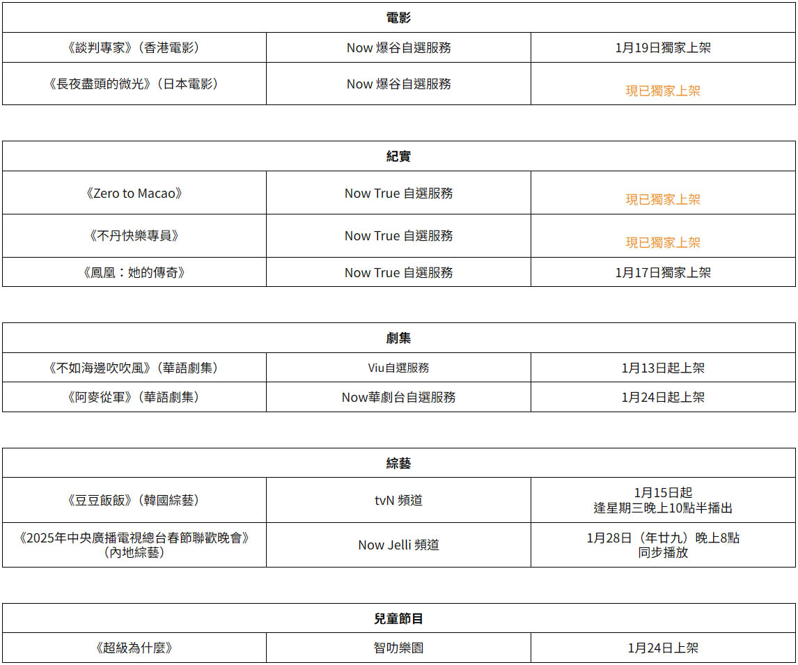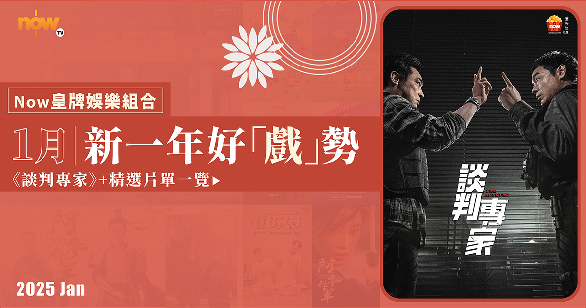【Now TV】踏入2025年,Now TV皇牌娛樂組合繼續為大家帶來精彩節目,「戲」勢由始起!率先有兩大好戲之人劉青雲、吳鎮宇的《談判專家》,以連場「舌戰」來造勢。隨後有香港女賽車手蕭詠雯 (Vivian Siu)的紀實片《Zero to Macao》。亦有中國首部女性視角劇情紀錄片《鳳凰:她的傳奇》,見證傳奇女性的歷史先鋒時刻。緊接著有集金鐘導演何潤東、郭雪芙、陳柏霖等的2024年「最美台劇」的《不如海邊吹吹風》。「最幸福」國度不丹,國民到底有幾咁幸福快樂?由「快樂專員」親身走訪當地,話你知不丹人點解咁快樂!仲有韓國人氣綜藝《種豆得豆》的洐生節目—《豆豆飯飯》的李光洙、都暻秀(EXO成員D.O.),用膳食為公司員工加油打氣。又點少得年廿九嘅《2025中央廣播電視總台春節聯歡晚會》,奧運健兒孫穎莎、馬龍,《白蛇傳》趙雅芝、葉童等等同你一齊迎接蛇年。事不宜遲,即睇片單!