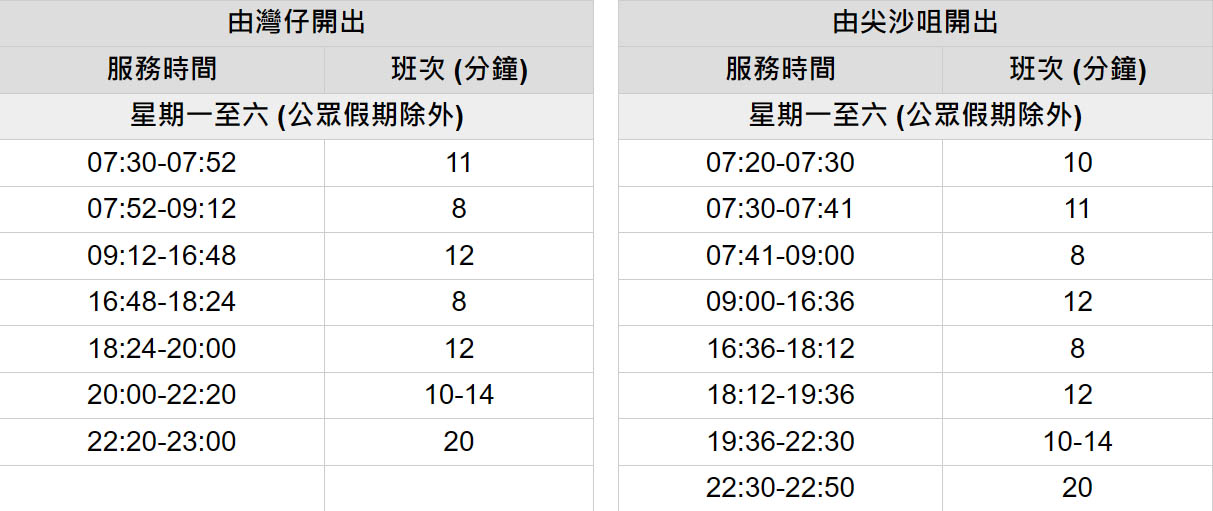 灣仔 / 尖沙咀渡輪服務航班時間表: