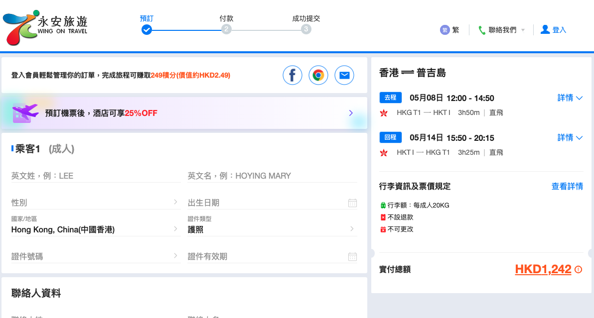 永安旅遊包20kg寄艙行李,來回連稅$1,242起,訂購網址: