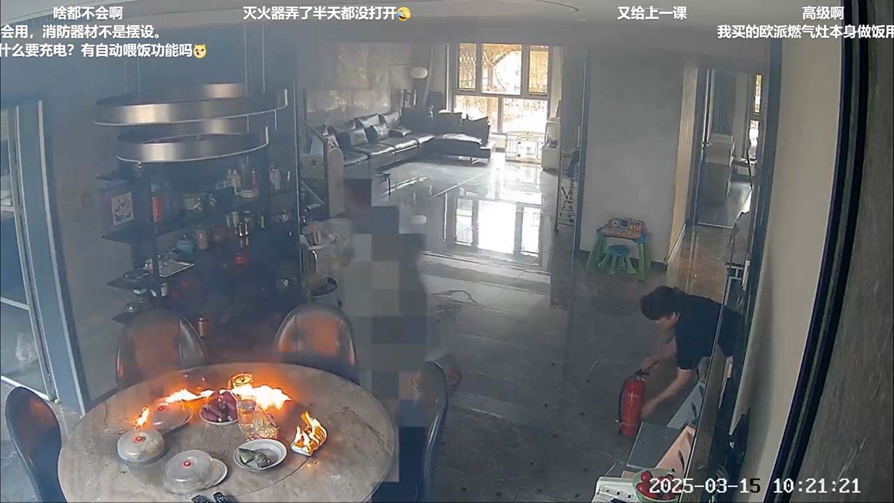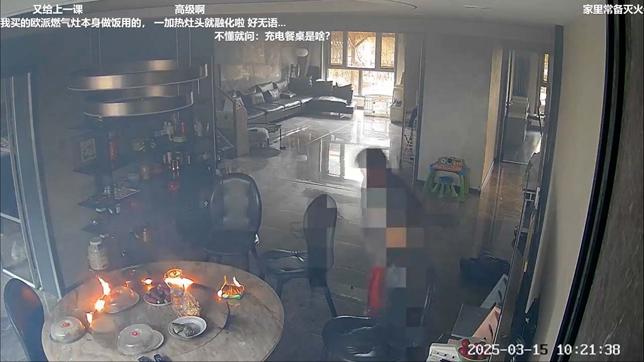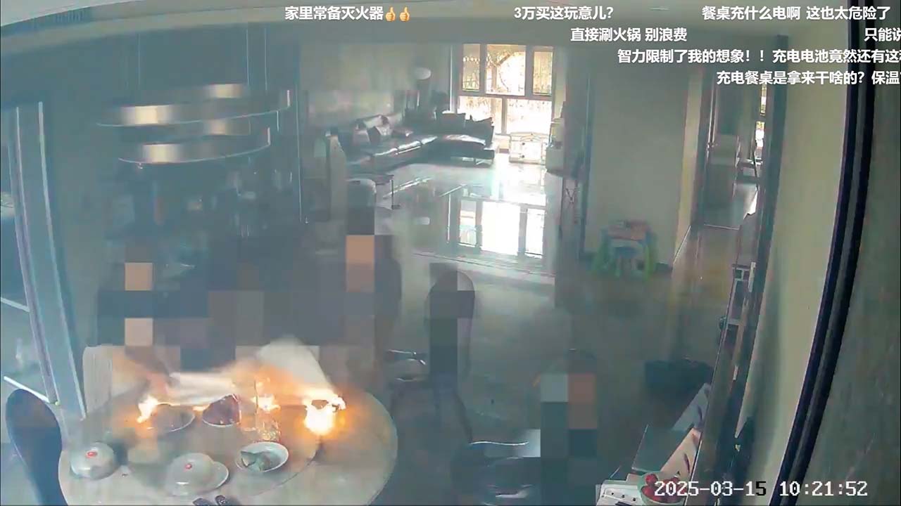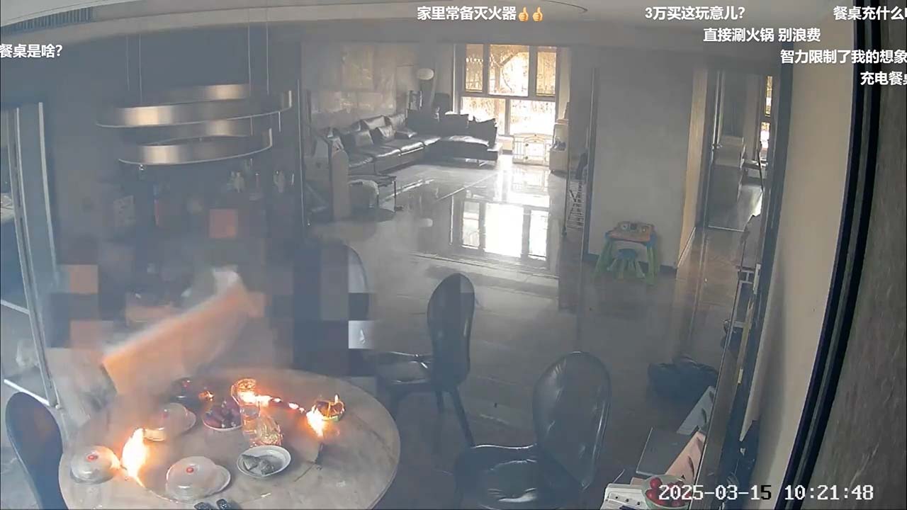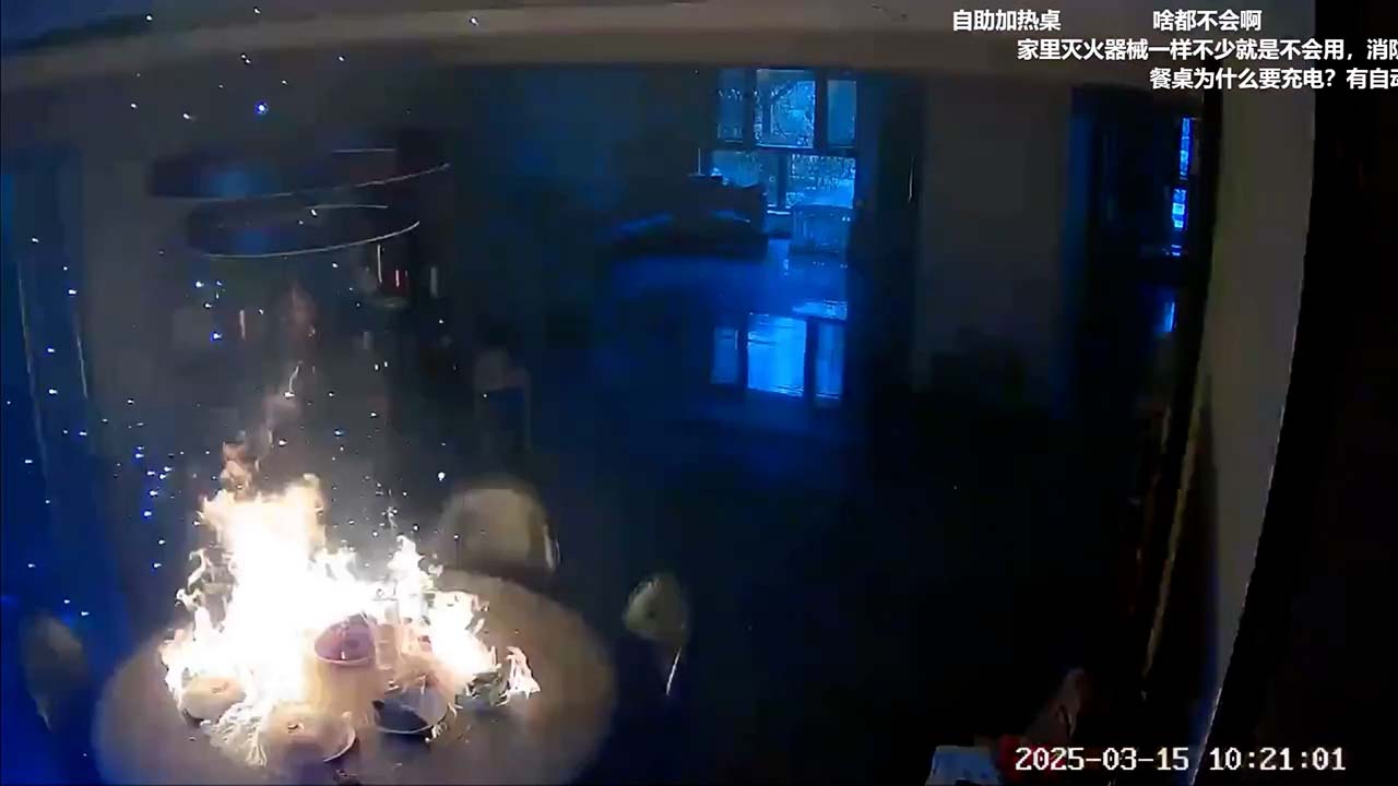 事發喺河北唐山一處住宅,閉路電視顯示上周六 (15日) 早上10點幾,電動飯枱上放咗四碟餸菜、一碟疑似係糭,另有一包面紙。10點20分,枱面突然爆燃起火,隨後火勢減弱。屋內兩名女子慌亂嘗試撲火,其中一人拿出滅火桶,但不知是不會用,還是力氣不夠拿不起噴向枱面火源,最終找到一塊布撲滅火焰。