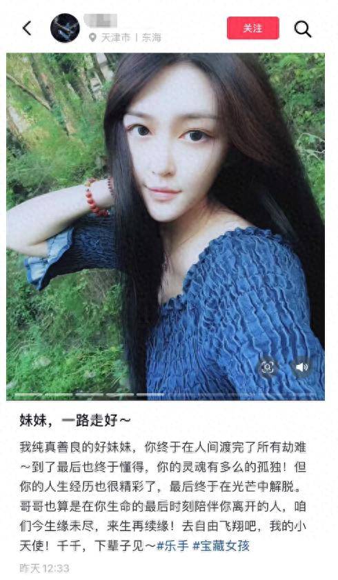 千千的哥哥發文表示,「妹妹,一路走好,我純真善良的好妹妹,你終於在人間渡完了所有劫難,到了最後也終於懂得,你的靈魂有多麽孤獨,但你的人生經歷也很精彩了,最後終於在光芒中解脫,哥哥也算是你生命最後時刻陪伴在你離開的人,我們今生緣未盡,來生再續緣,去自由飛行吧,我的小天使,千千下輩子見。」