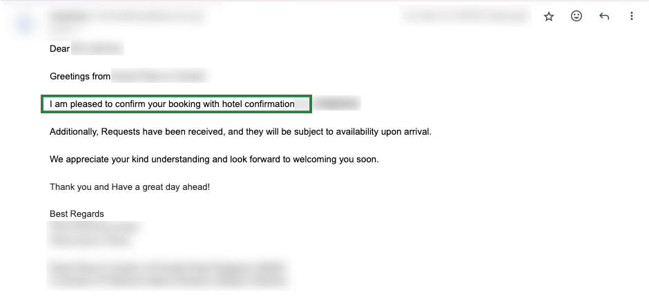 當檢查清楚資料無誤發送電郵後,以小編的個案為例,酒店通常會在幾個工作天內回覆,確認你是否成功預訂。