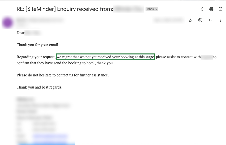 若酒店指尚未收到相關預訂,就需要聯繫中介平台,並提供平台的確認信和其他參考編號,以便酒店進一步查詢。