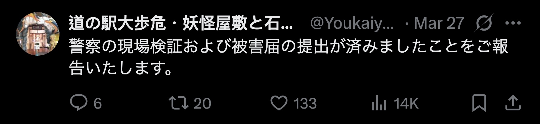 博物館負責人表示已經報警,並提交損失報告,希望以此帖文警告其他擁有扭蛋機的店家,要提高警惕,避免有人以同樣手法詐騙,造成損失。