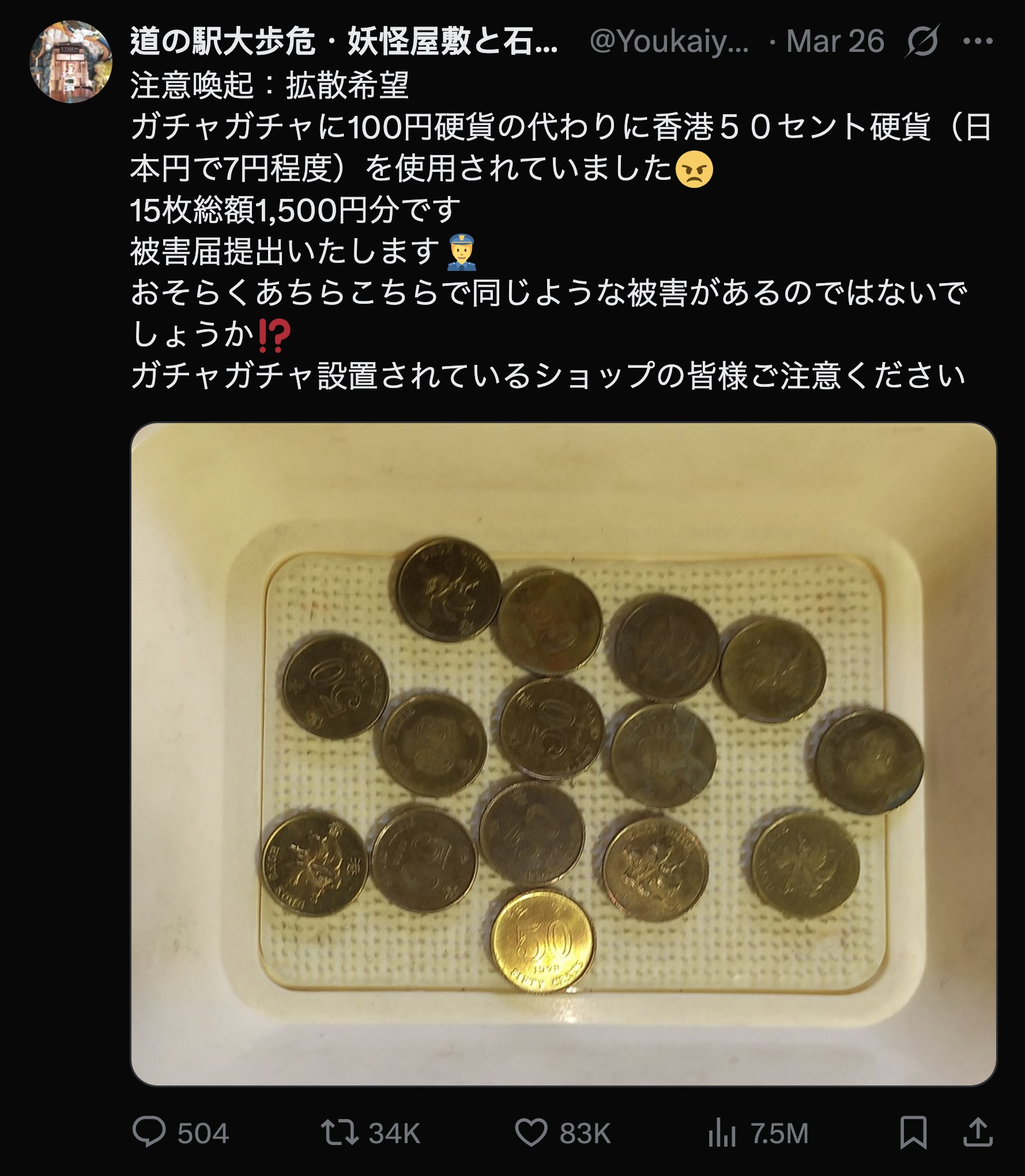 位於日本德島縣的妖怪屋敷と石の博物館於社交平台X發文,表示日前在館內的扭蛋機中發現15枚5毫港元硬幣,並懷疑有遊客以5毫港元冒充100日圓(價值約5.2港元)使用扭蛋機,令博物館一共損失1500日圓(約77.5港元)。