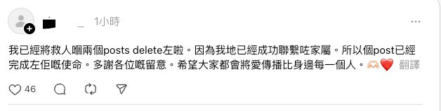 今日(31日)發文者指,已經將Threads上兩個帖文刪除,希望大家可以將愛傳播給身邊的人,「我地已經成功聯繫咗家屬,所以個post已經完成左佢嘅使命。多謝各位嘅留意。希望大家都會將愛傳播比身邊每一個人。」