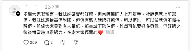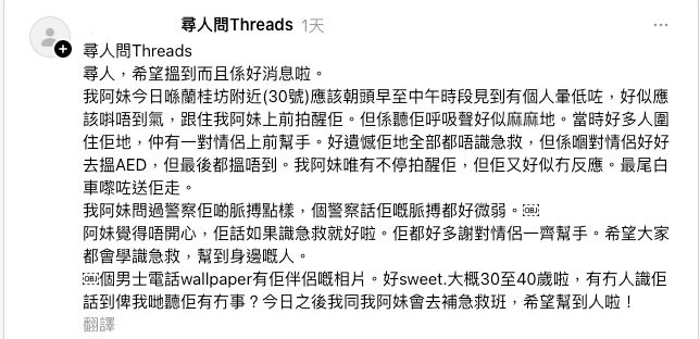 該名有份施予援手的女途人,其胞姊剛過去的周日(30日)凌晨在Threads發文,指當日中午胞妹在蘭桂坊附近見到事主暈倒及呼吸困難,事出突然,她十分害怕,但冷靜後仍鼓起勇氣上前協助,「我妹妹確實都好驚,但當時無咩人上前幫手,冷靜完就上前幫佢。我妹妹想抬高佢對腳,但係有路人話唔好掂佢,所以佢唯一可以做就係不斷拍醒佢。」