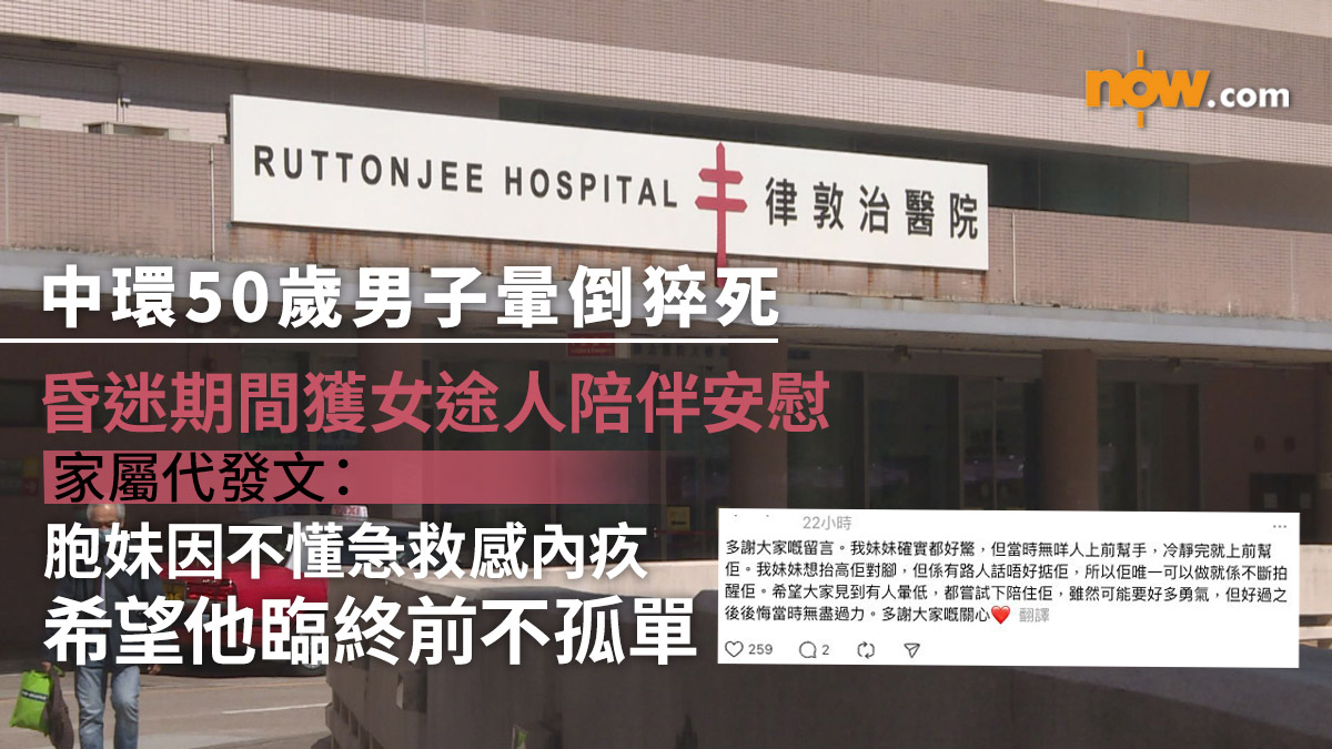 【Now.com】一名50歲男子上周六(29日)在中環街頭猝死,壯年逝世固然令人婉惜,但背後見證了一段人間有愛的故事。當男事主暈倒時,一名熱心的女途人曾上前協助,事後其姐姐在社交平台Threads發文尋人,希望得知男事主的最新情況,當得悉噩耗後,坦言十分遺憾。