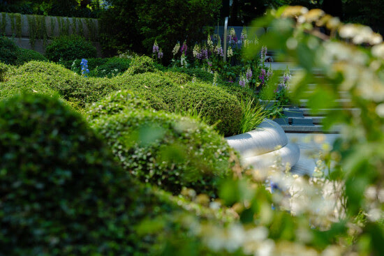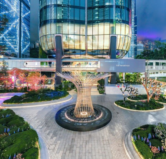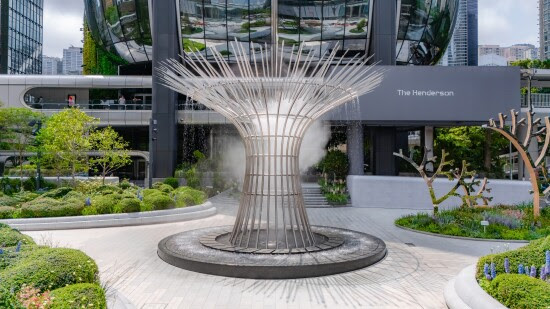 而園內的花圃設計由英國樹木造型師Darren Lerigo負責,以獨特的修剪手法,為花園設計別具風格的流線型的植物,呼應附近大廈的外型設計。