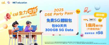 Csl推出2025 DSE Party Pass 5G體驗包,應屆DSE考生由即日起至2025年7月31日,只需要在網上登記,即可免費換領2025 DSE Party Pass 5G體驗包^,無需簽約即可享有90日共300GB的5G本地數據,更可享有Now TV Now True 1個月通行證*。如考生未滿18歲,則須由18歲或以上之其監護人並持有效香港居民身份證代為登記。