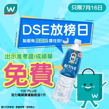 屈臣氏宣布於2025年7月16日DSE放榜日為應屆學生打打氣。應屆DSE考生只需要在放榜日到屈臣氏門市,出示准考證或成績單,即可免費獲得100 PLUS活力電解質運動飲品1升1支。*