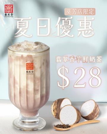 春水堂推出葵芳店限定優惠,由即日起至8月31日,顧客可以$28購買翡翠香芋鮮奶茶。