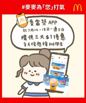 麥當勞一連5日推出DSE應援優惠,2025年7月14日起至7月18日,麥當勞App用戶可享用以下$1優惠: