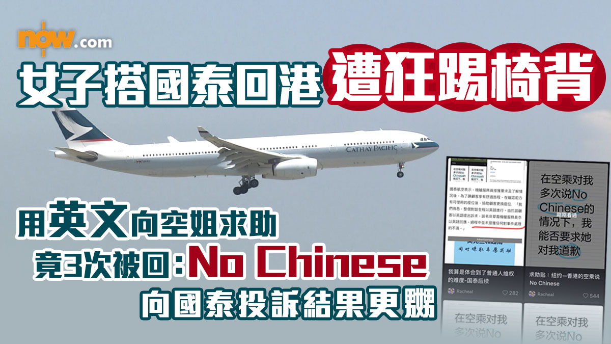 【Now.com】國泰航空再次發生乘客遭踢椅背風波,一名女子在小紅書發帖投訴自己在4月29日從紐約飛往香港的航班上,遭後排乘客踢凳拒絕她調整座椅靠背,她隨後用英文向一名非華裔的空姐求助,卻屢獲對方回應「No Chinese」及冷淡對待,主動要求下才獲更換新座位,但位上的充電插頭是失靈的。