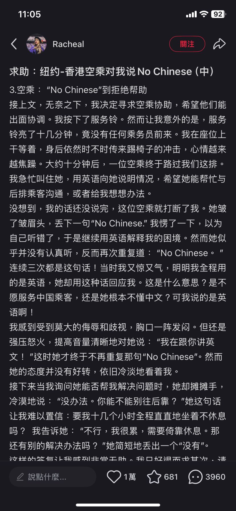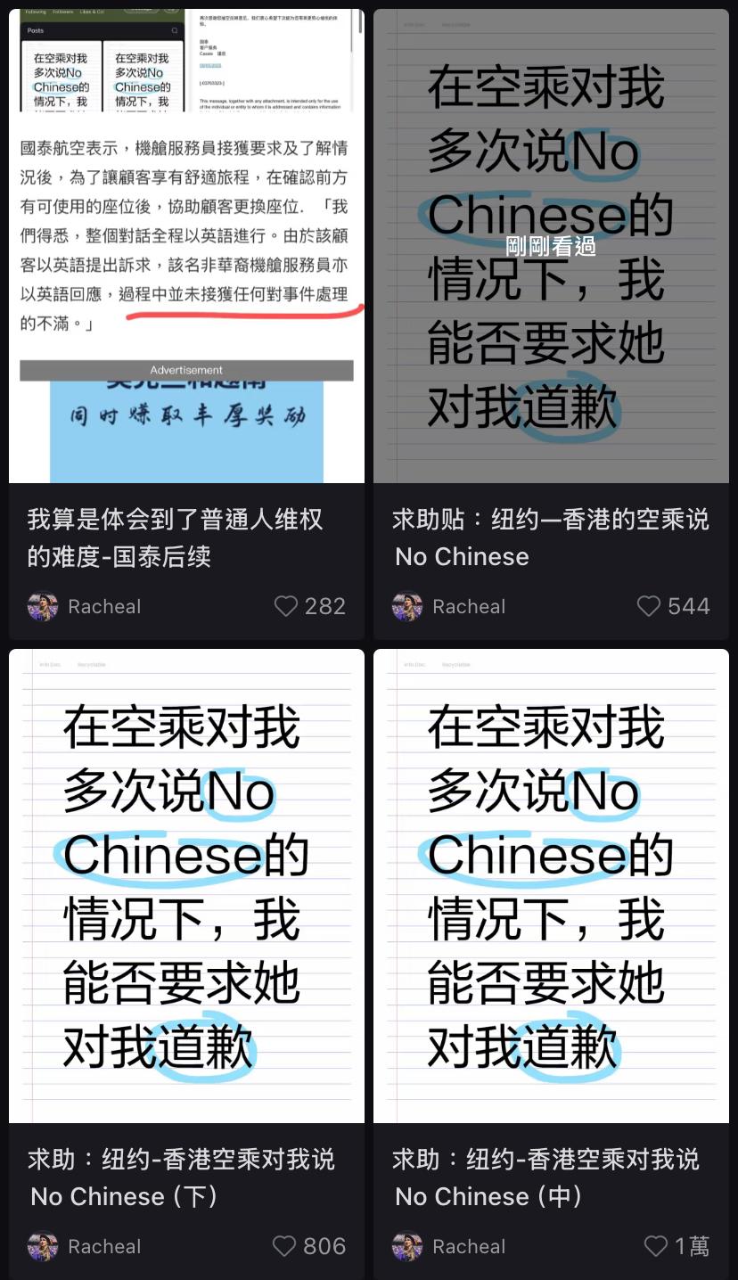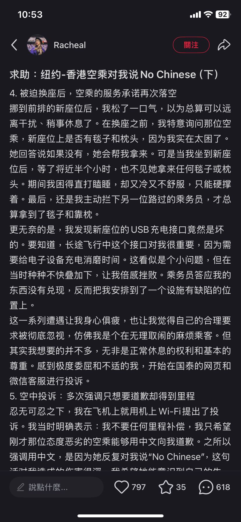 Rachea質疑,「這是什麼意思?是不願服務中國乘客,還是她根本不懂中文?可我說的是英語啊!我感到受到莫大的侮辱和歧視,胸口一陣發悶。但還是強壓怒火,提高音量清晰地對她說:『我在跟你講英文!』這時她才終於不再重復那句『No Chinese』,然而她的態度並沒有好轉,依舊冷淡地看著我。」