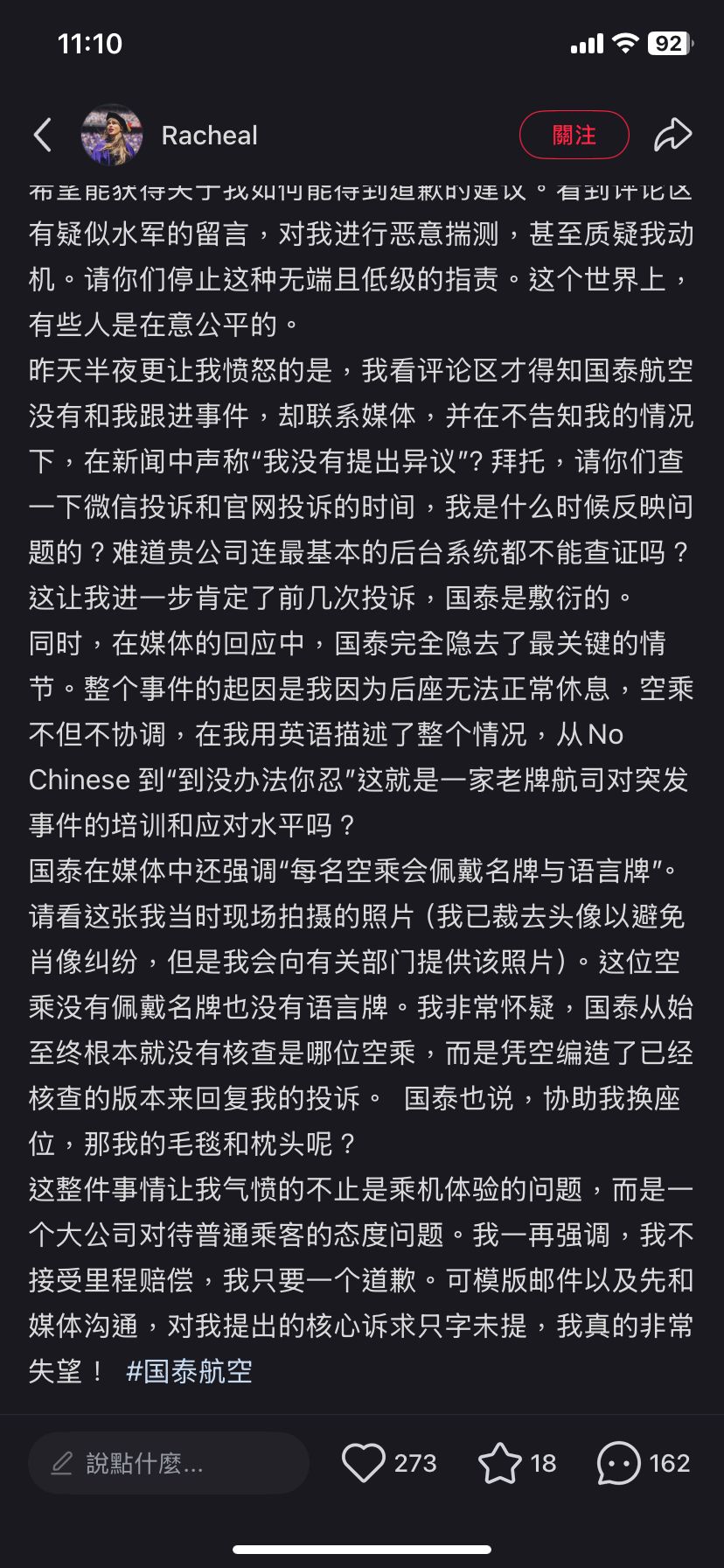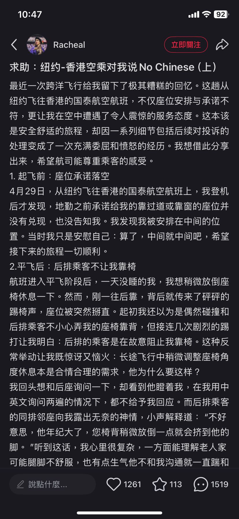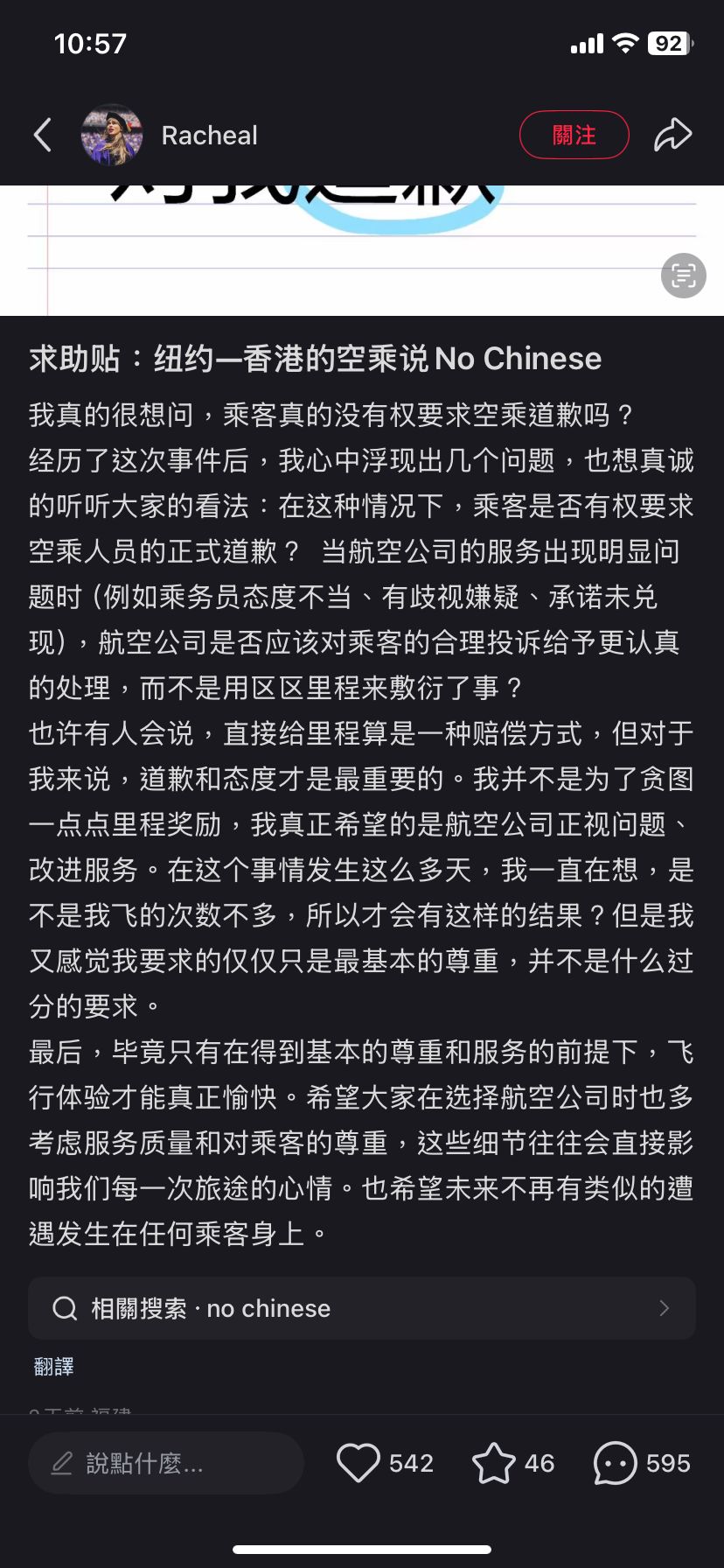 Rachea質疑,「這是什麼意思?是不願服務中國乘客,還是她根本不懂中文?可我說的是英語啊!我感到受到莫大的侮辱和歧視,胸口一陣發悶。但還是強壓怒火,提高音量清晰地對她說:『我在跟你講英文!』這時她才終於不再重復那句『No Chinese』,然而她的態度並沒有好轉,依舊冷淡地看著我。」