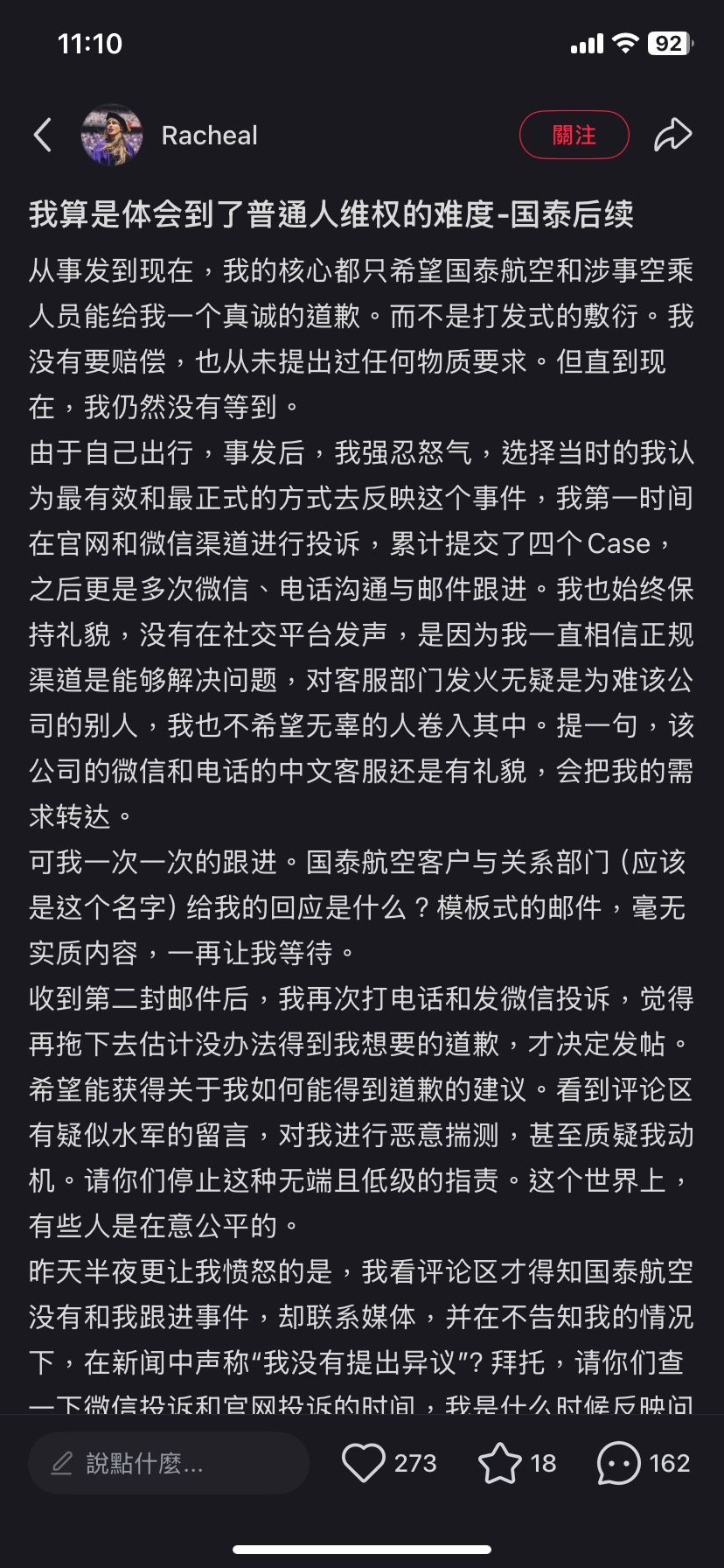 該女子批評,涉事空姐失禮及態度令事主感到冒犯,事後向國泰投訴,要求空姐道歉,國泰卻屢次只回覆將贈送她飛行里數,並指公司沒有道歉的政策,事主怒斥國泰對乘客沒有基本的尊重。