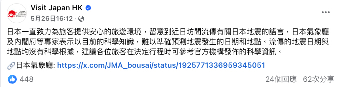 日本國家旅遊局香港辦事處在社交平台發文,指流傳的地震日期與地點均沒有科學根據:「日本氣象廳及內閣府等專家表示以目前的科學知識,難以準確預測地震發生的日期和地點。」呼籲民眾冷靜,建議旅客在決定行程時,可參考官方機構發布的科學資訊。