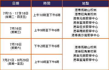 即場報名日期:7月16日至7月18日(上午 9 時 至 下午 6 時)、7月19日至7月21日(上午 9 時 至 中午12 時)