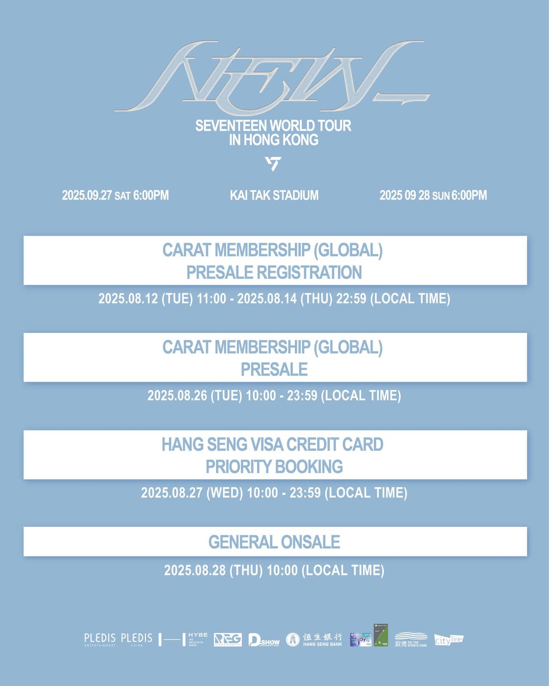 門票於即日起至8月14日晚上10時59分,接受於Weverse Shop上購買CARAT Membership(GLOBAL)的會員優先登記,成功登記後可於8月26日上午10時至晚上11時59分優先購票。隨後一日接受恒生Visa信用卡用戶優先購票,門票將於8月28日上午10時起透過Cityline公開發售。Now.com將為大家繼續帶來巡演的最新資訊,CARAT們記得鎖定Now.com!