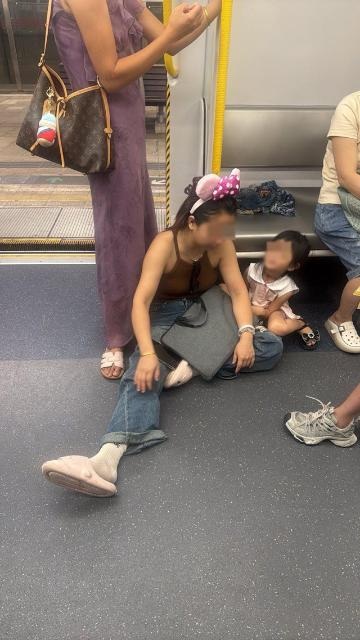 第一張相片顯示,一名戴頭箍女子坐在座位前的地上,並將右腳伸出車廂通道;其後方有一名穿紫色吊帶連身裙的女子緊靠扶手而站;一名女童則躺在座位上,穿着鞋抬起雙腳踩在扶手玻璃上。