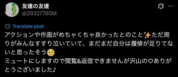 發文的日本媽媽在兒子觀看完《鬼滅之刃劇場版 無限城篇》後,也有再度發文回應網民,她表示兒子對電影的評價是:動作場口和動畫的製作非常精美,不過他周圍的觀眾也看到哭,相信自己做的準備仍然不足。