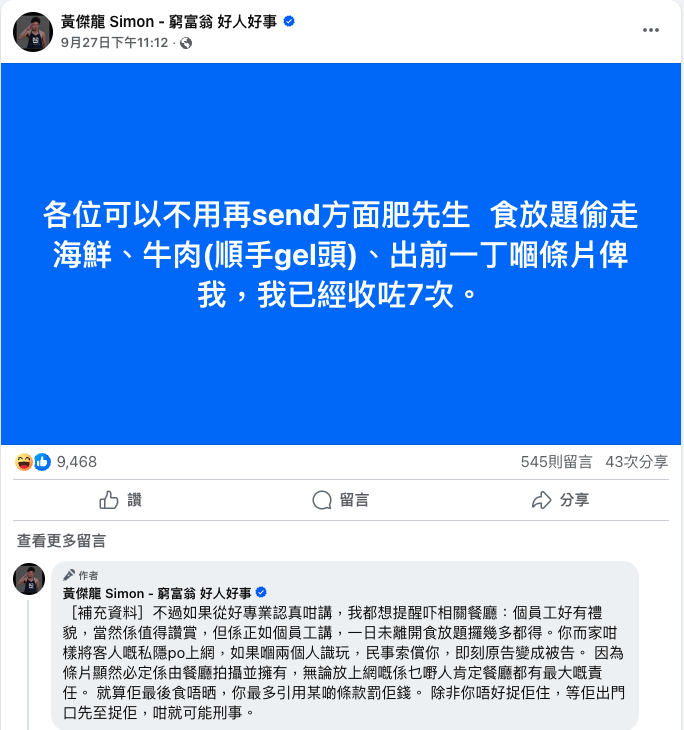 事後黃傑龍在社交網站讚揚,涉事員工有禮貌,處理得當,但提醒相關餐廳涉事影片被放上網,「無論放上網嘅係乜嘢人肯定餐廳都有最大嘅責任」,事主有權循民事索償追討損失,店方「即刻原告變成被告」。
