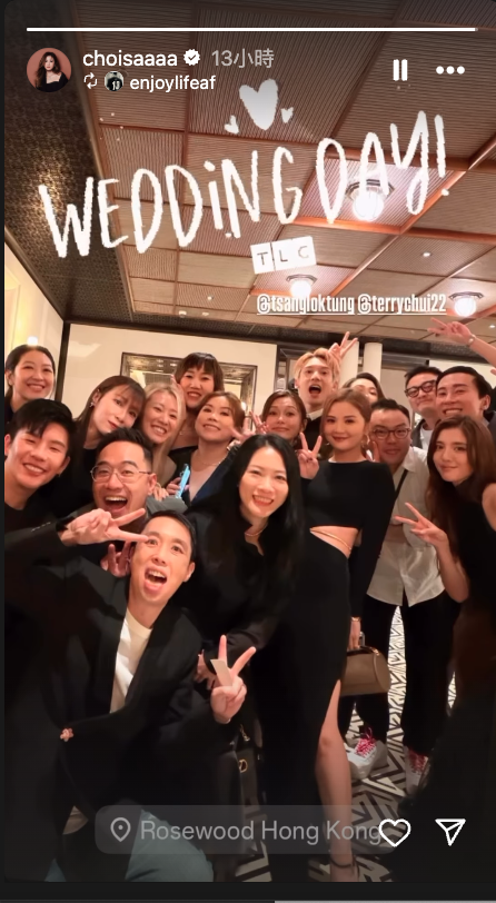 【Now.com】女歌手曾樂彤與音樂人徐浩結束愛情長跑,昨晚(12日)在尖沙咀一間五星級酒店舉行婚禮,多名圈中好友到場祝賀,包括MIRROR九位成員盧瀚霆、江𤒹生、李駿傑、呂爵安、柳應廷、王智德、陳瑞輝、陳卓賢、邱傲然、蔡卓妍(阿Sa)、吳千語、馬天佑、影后衛詩雅和老公、李幸倪、關智斌、吳肇軒、陳蕾、張繼聰和老婆謝安琪、泳兒、艾妮、關心妍和老公、沈震軒和女友陳欣妍等。