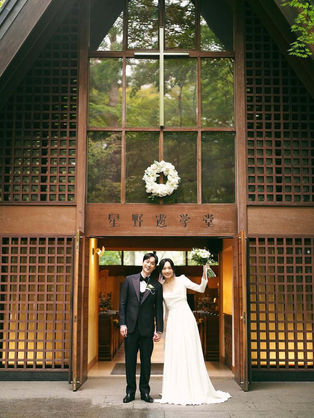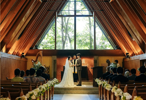 而劉俊謙、蔡思韵行禮的高原教堂位於輕井澤星野度假區內,前身是建於1921年的「星野遊學堂」,是日本最早舉辦西式婚禮的場所之一。教堂保留全木造建築與標誌性三角屋頂,宛如森林中的童話小屋。其門楣上仍刻著「星野遊學堂」字樣,見證日本大正時期思想家聚首的歷史痕跡。教堂每逢周日會舉行禮拜,平日開放予公眾參觀,是熱門旅遊景點。