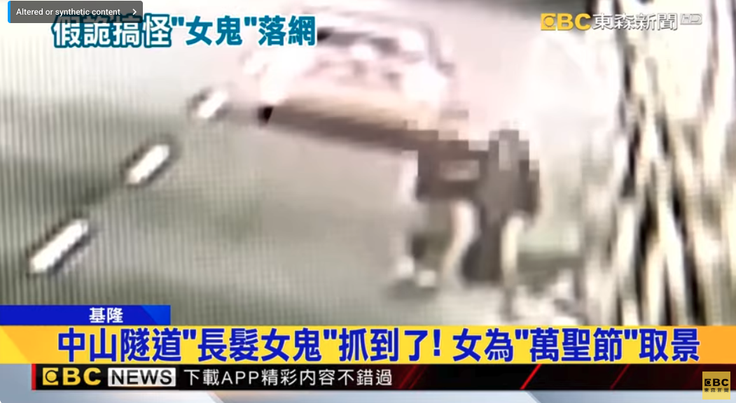 【Now.com】萬聖節來臨,台灣基隆市有隧道驚傳「靈異事件」! 一名賴姓司機近日揸夜車行經基隆中山區的隧道時,驚見一名長髮及肩、全身黑衣的女子站在路旁,嚇到以為「撞鬼」,事後更因心神不寧釀車禍受輕傷。警方調查後揭發,三名年輕人為拍攝萬聖節宣傳影片,在隧道內違規取景,全數被依法檢控。