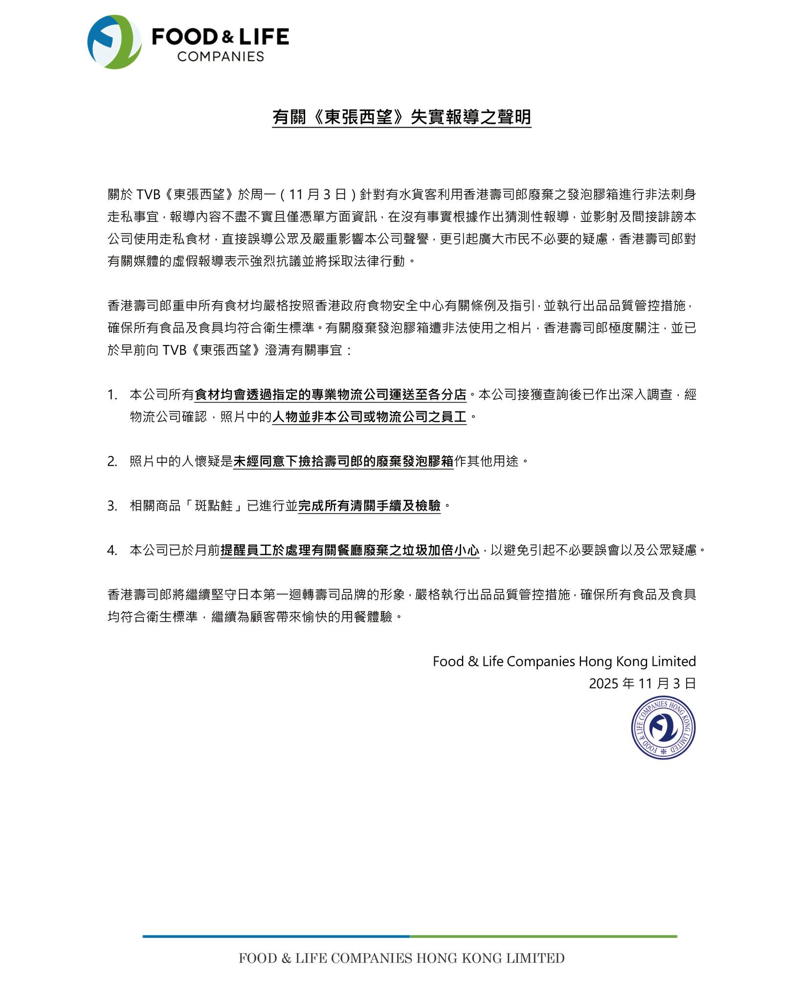 【Now.com】無綫電視節目《東張西望》周一(3日)播出調查報道,指有水貨客從內地偷運魚生及海鮮到港,並暗示可能供應予大型連鎖壽司店。雖然節目未有點名,但畫面中出現印有壽司分店編號的發泡膠箱,隨即引發網民猜測疑似涉及大型連鎖壽司店「壽司郎」。壽司郎母公司FOOD & LIFE Companies當晚立即發表嚴正聲明,直斥報道「不盡不實」、「影射及間接誹謗」,並表明將採取法律行動。