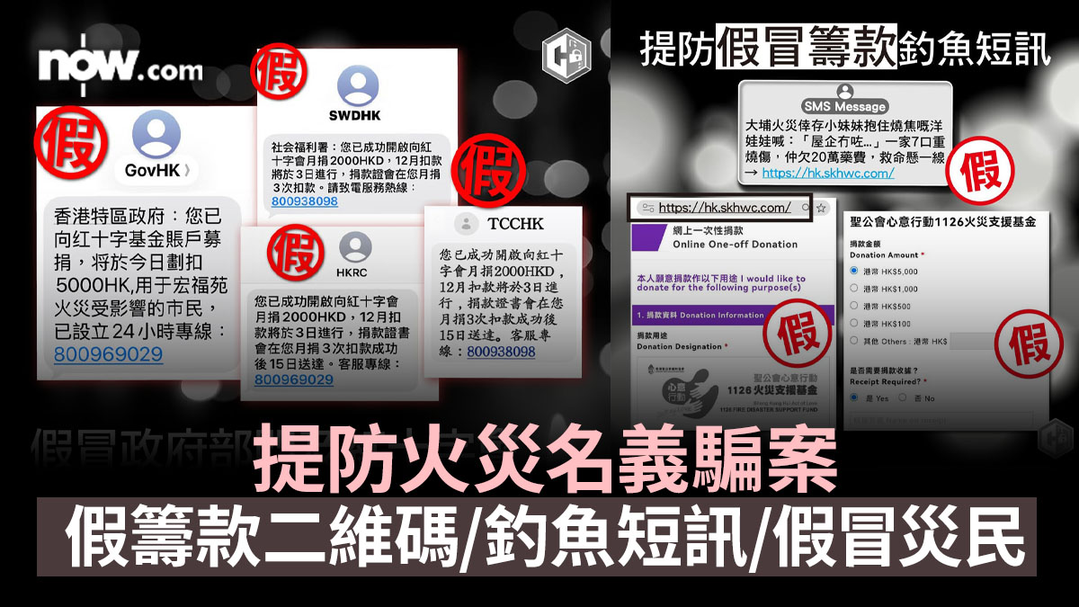 【Now.com】大埔宏福苑五級火災事故讓全城陷入悲痛,各界紛紛伸出援手,並捐款支援災民,然而騙徒卻利用市民的善心來行騙,包括假冒慈善機構及政府部門發出釣魚訊息、假網站等,意圖騙取市民善款。