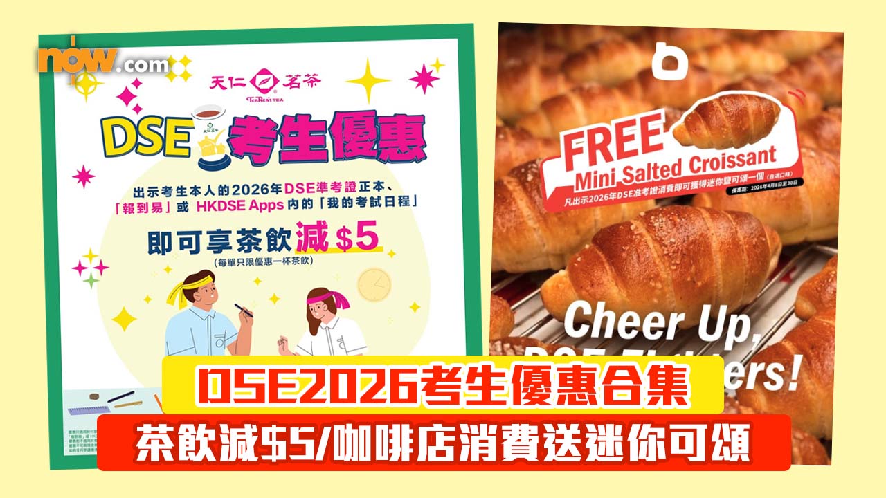 【Now.com】中學文憑試(DSE)2026已經開考,本港不少商戶推出消費優惠支持考生,包括買手搖飲品平$5、荃灣咖啡店飲品7折優惠等,即睇下文介紹了解更多!