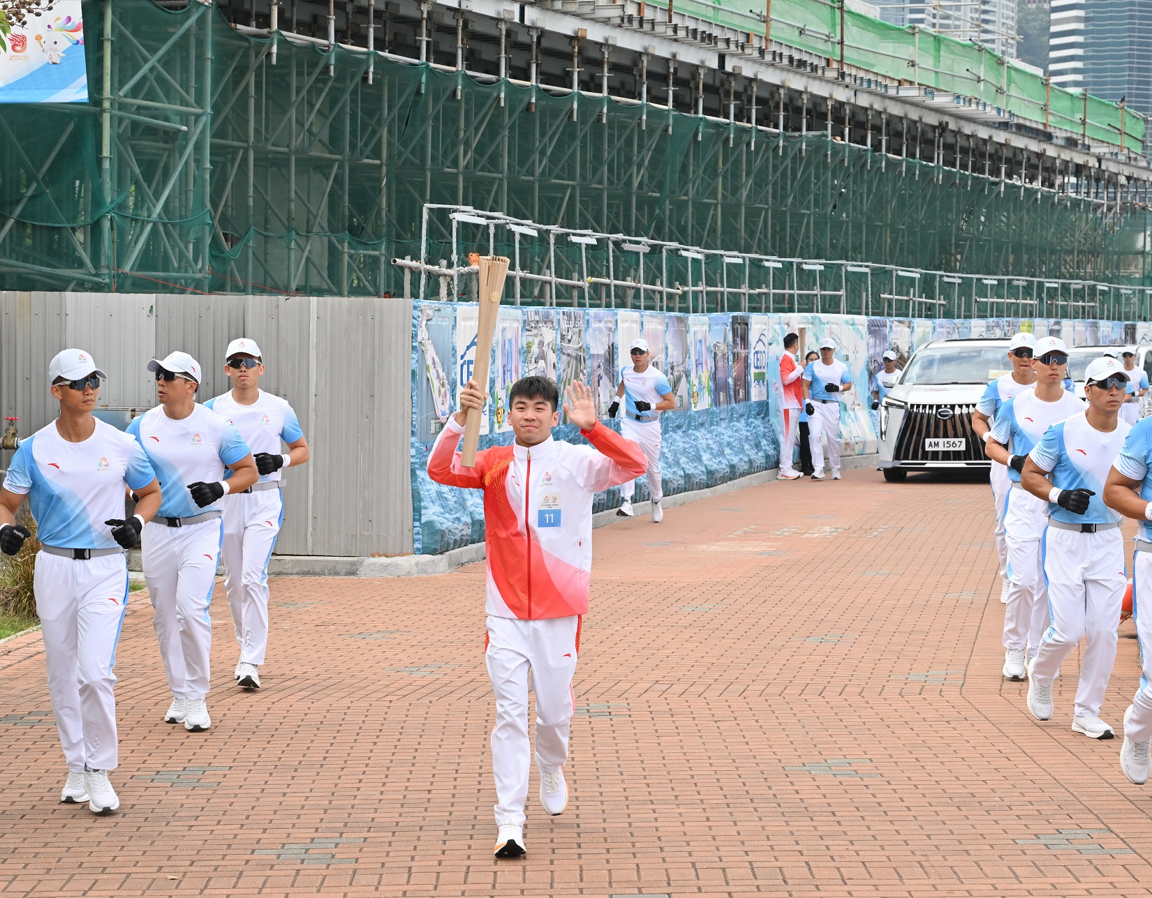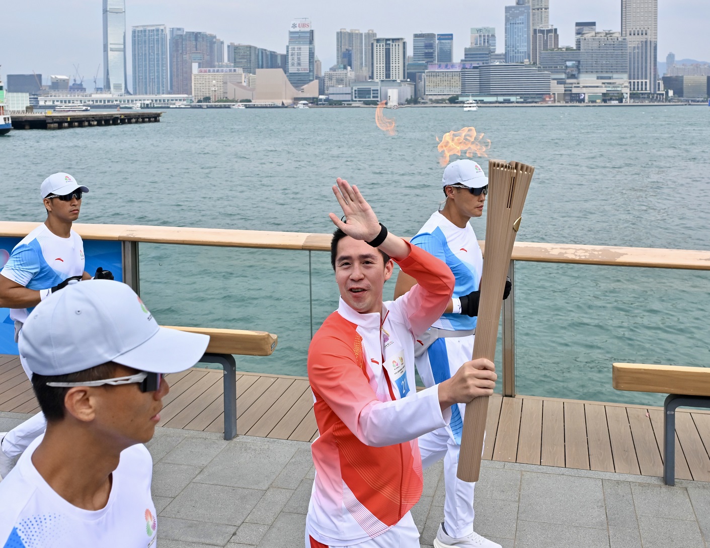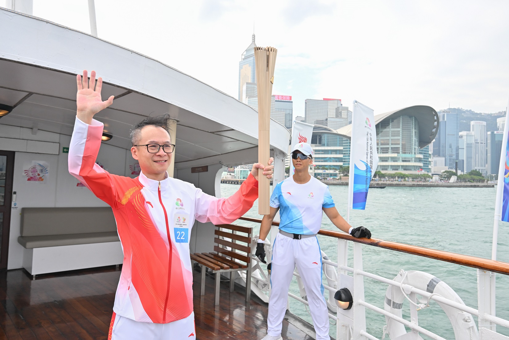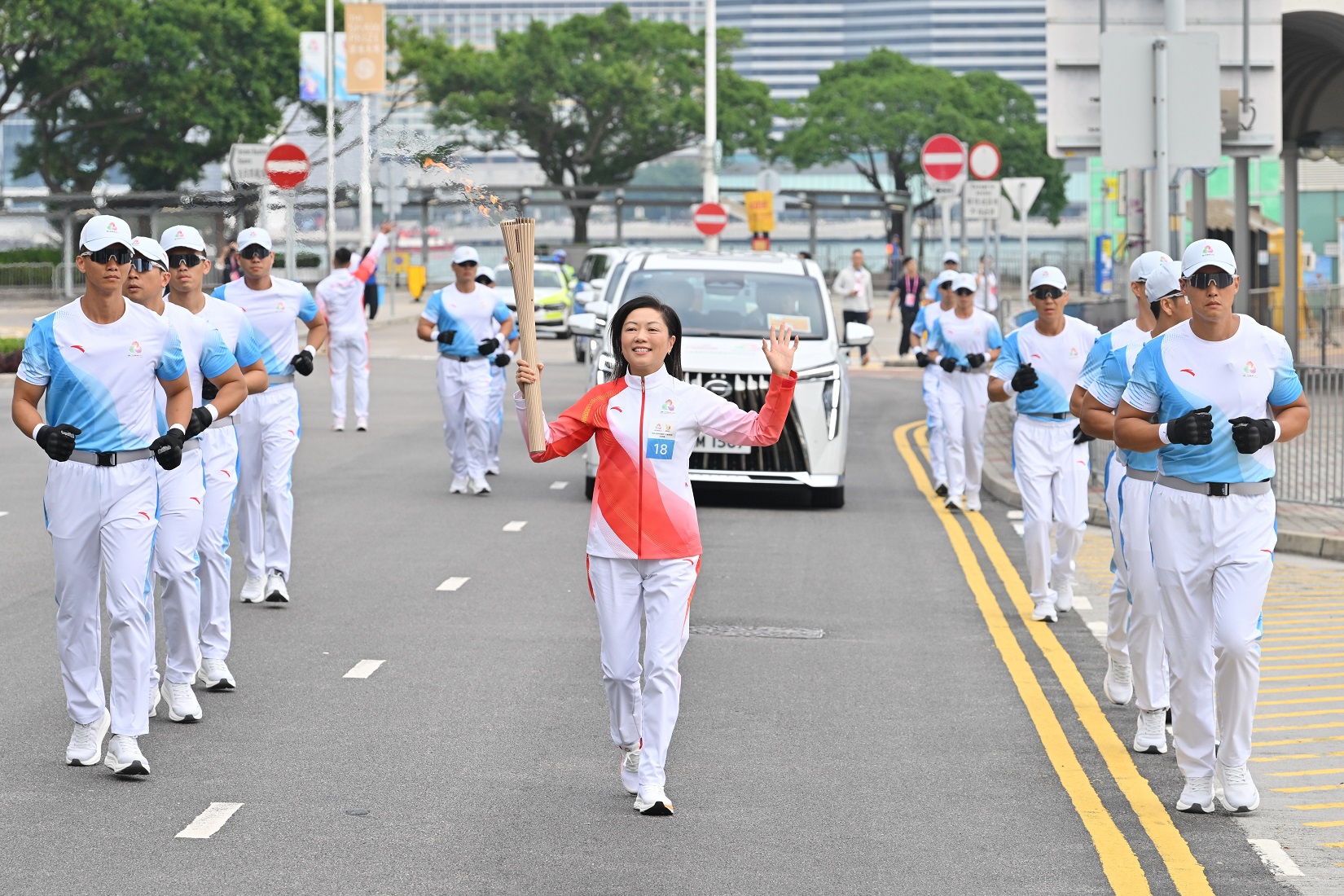 隨著文化體育及旅遊局局長羅淑佩用火種棒燃點火種盆,並由陳國基點燃火炬棒,再交由第一棒火炬手、香港乒乓球代表黃鎮廷,正式展開香港賽區的火炬接力傳遞,最終送抵啟德體育園中央廣場,再由最後一棒、世大運金牌得主、港隊女子重劍代表佘繕妡點燃火盆完成傳遞。