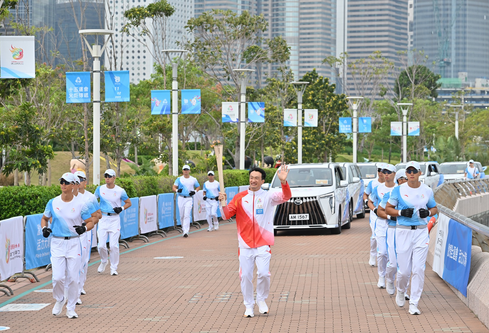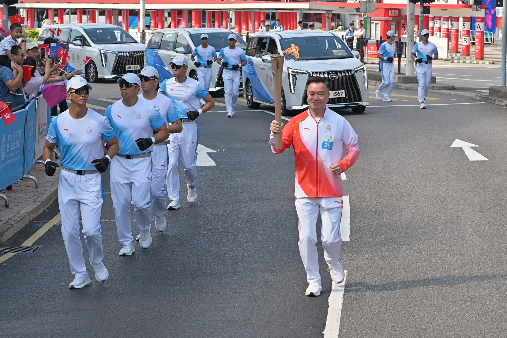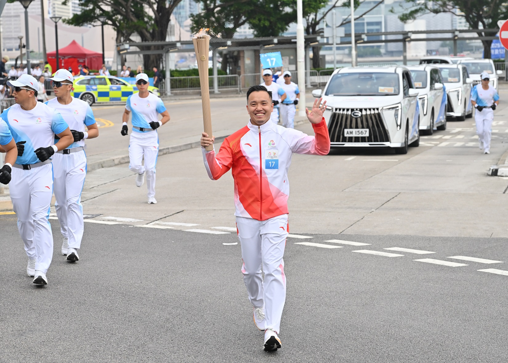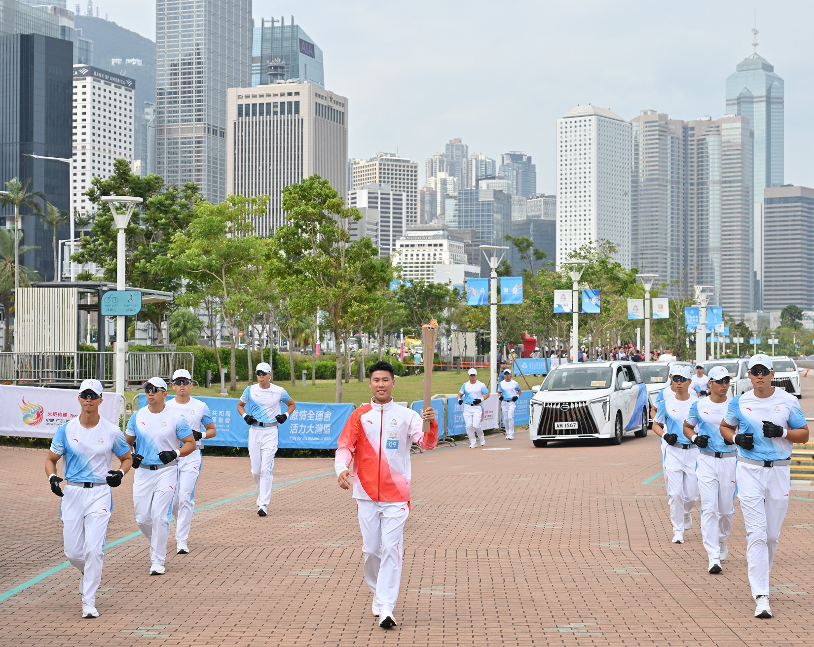 隨著文化體育及旅遊局局長羅淑佩用火種棒燃點火種盆,並由陳國基點燃火炬棒,再交由第一棒火炬手、香港乒乓球代表黃鎮廷,正式展開香港賽區的火炬接力傳遞,最終送抵啟德體育園中央廣場,再由最後一棒、世大運金牌得主、港隊女子重劍代表佘繕妡點燃火盆完成傳遞。