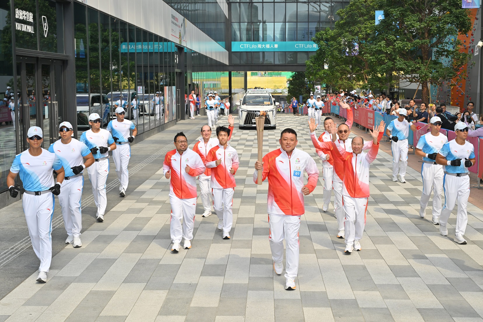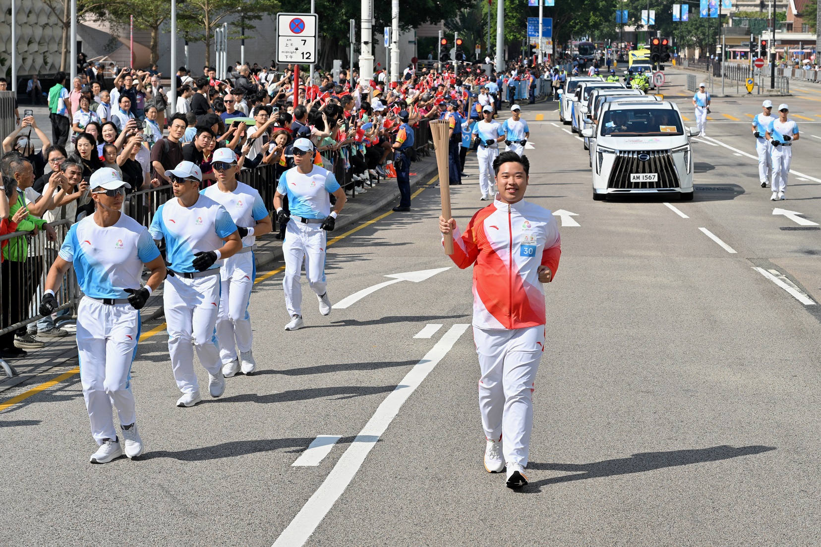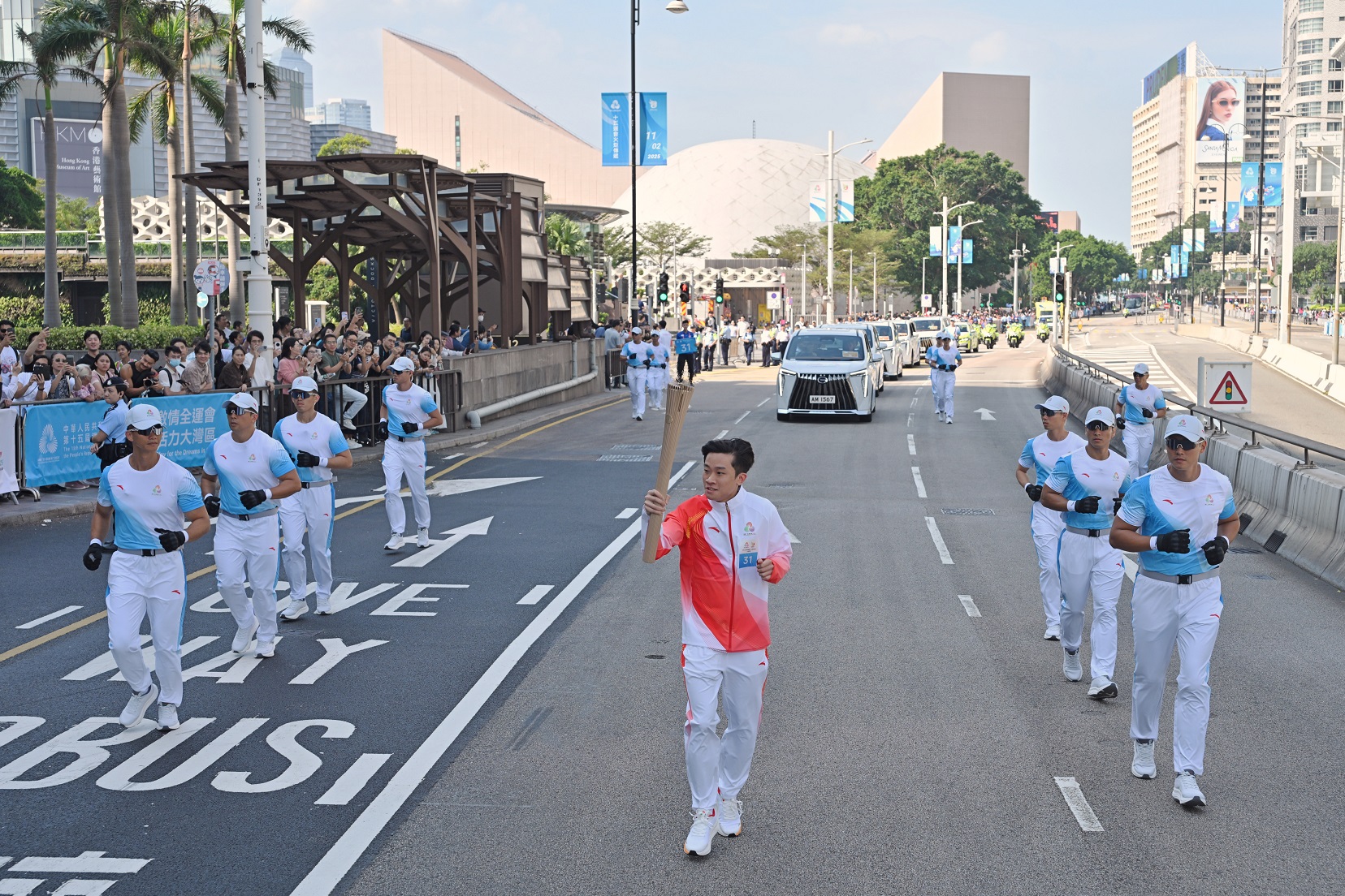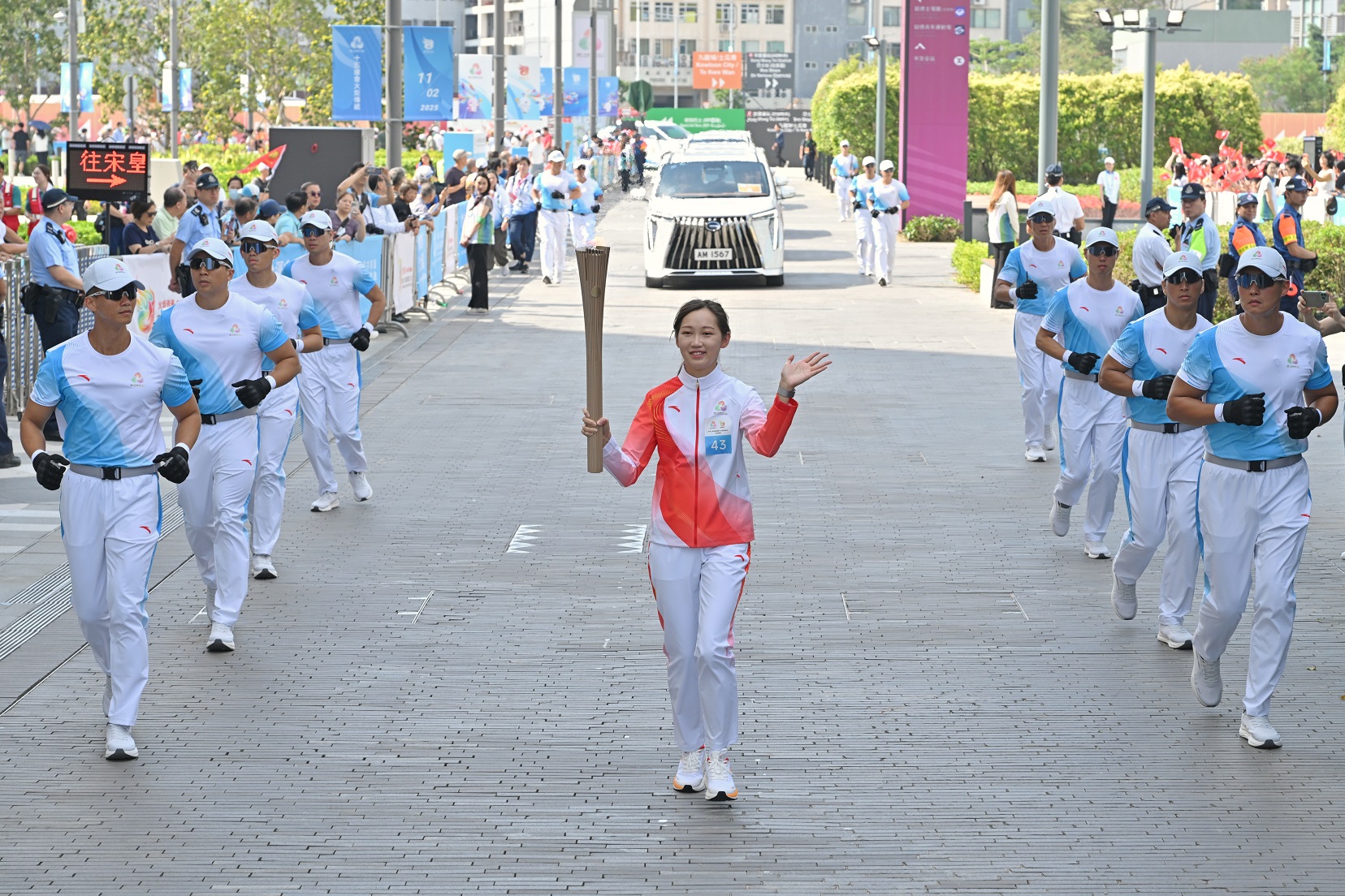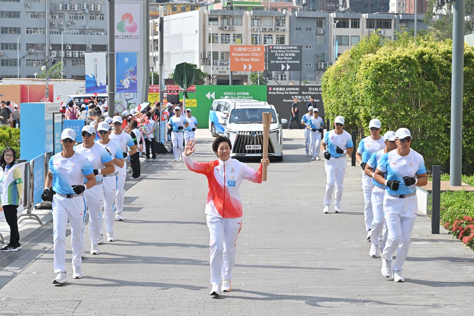 隨著文化體育及旅遊局局長羅淑佩用火種棒燃點火種盆,並由陳國基點燃火炬棒,再交由第一棒火炬手、香港乒乓球代表黃鎮廷,正式展開香港賽區的火炬接力傳遞,最終送抵啟德體育園中央廣場,再由最後一棒、世大運金牌得主、港隊女子重劍代表佘繕妡點燃火盆完成傳遞。