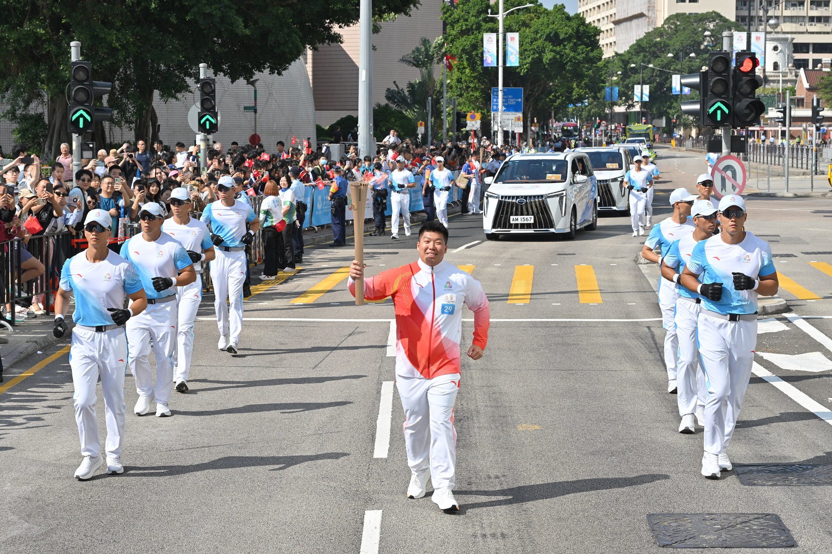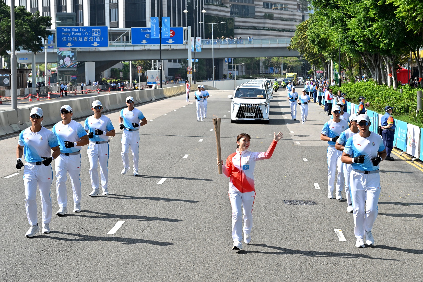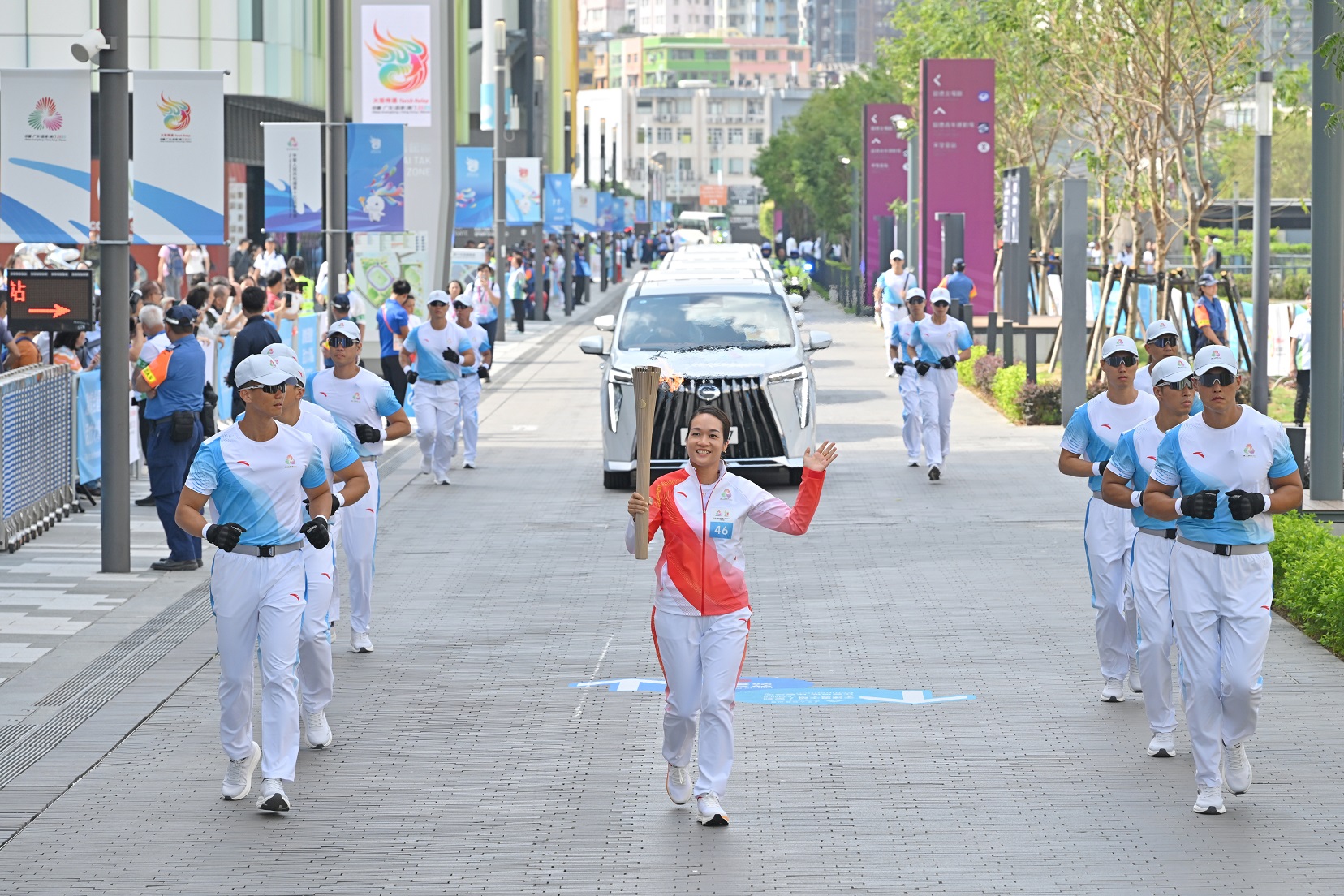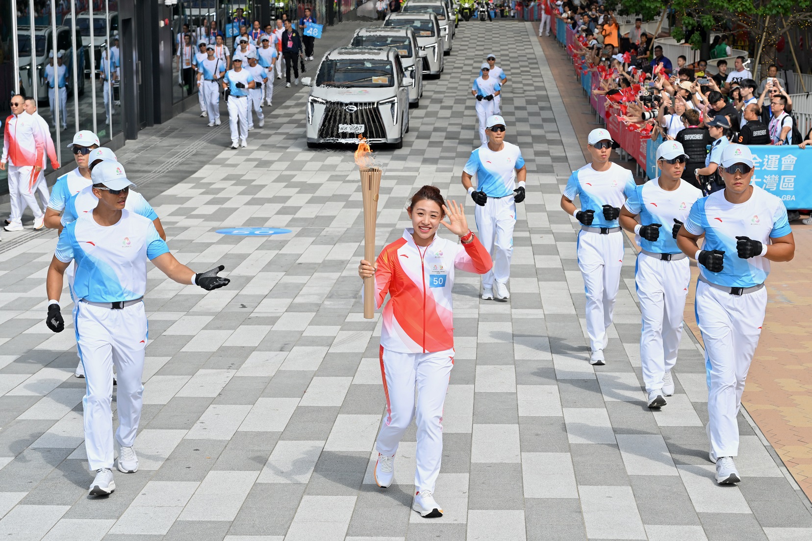 隨著文化體育及旅遊局局長羅淑佩用火種棒燃點火種盆,並由陳國基點燃火炬棒,再交由第一棒火炬手、香港乒乓球代表黃鎮廷,正式展開香港賽區的火炬接力傳遞,最終送抵啟德體育園中央廣場,再由最後一棒、世大運金牌得主、港隊女子重劍代表佘繕妡點燃火盆完成傳遞。