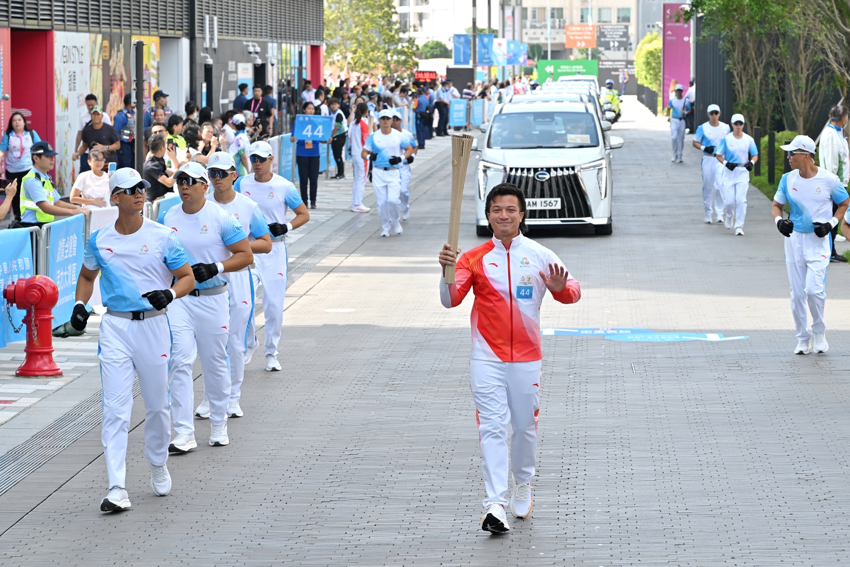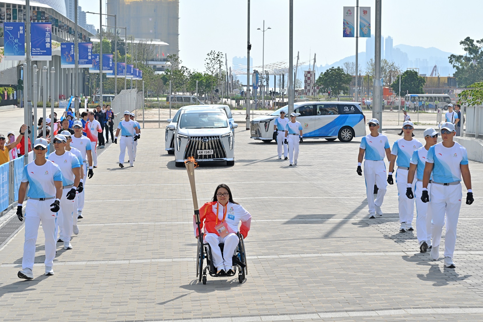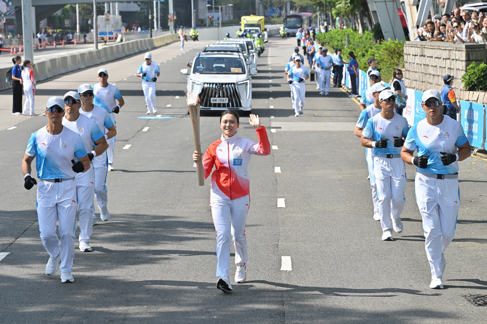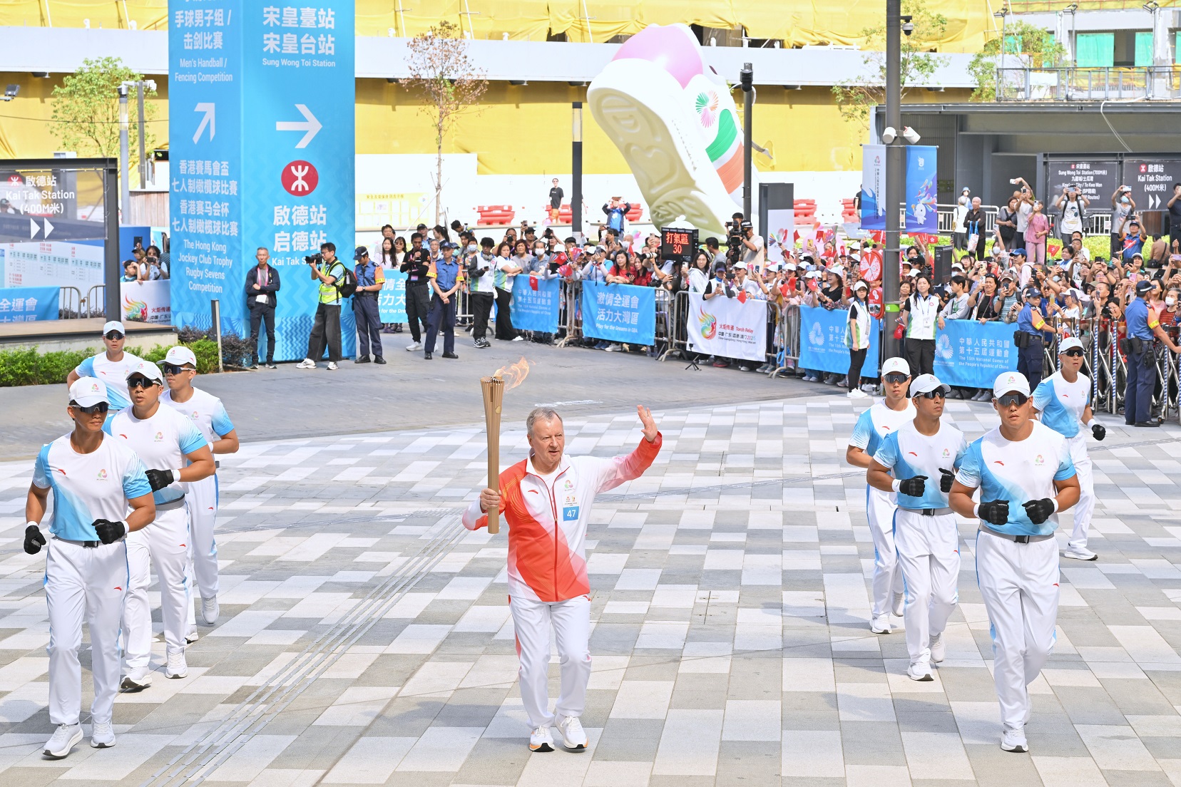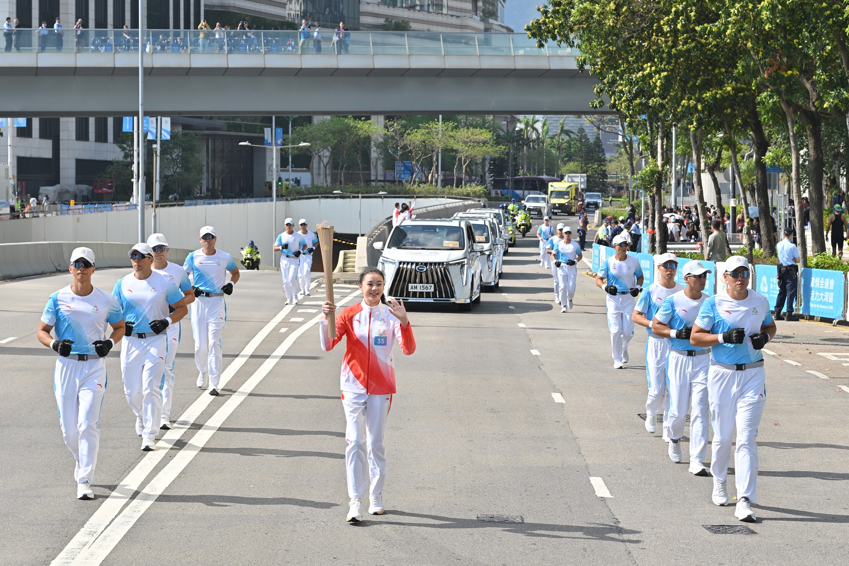 隨著文化體育及旅遊局局長羅淑佩用火種棒燃點火種盆,並由陳國基點燃火炬棒,再交由第一棒火炬手、香港乒乓球代表黃鎮廷,正式展開香港賽區的火炬接力傳遞,最終送抵啟德體育園中央廣場,再由最後一棒、世大運金牌得主、港隊女子重劍代表佘繕妡點燃火盆完成傳遞。